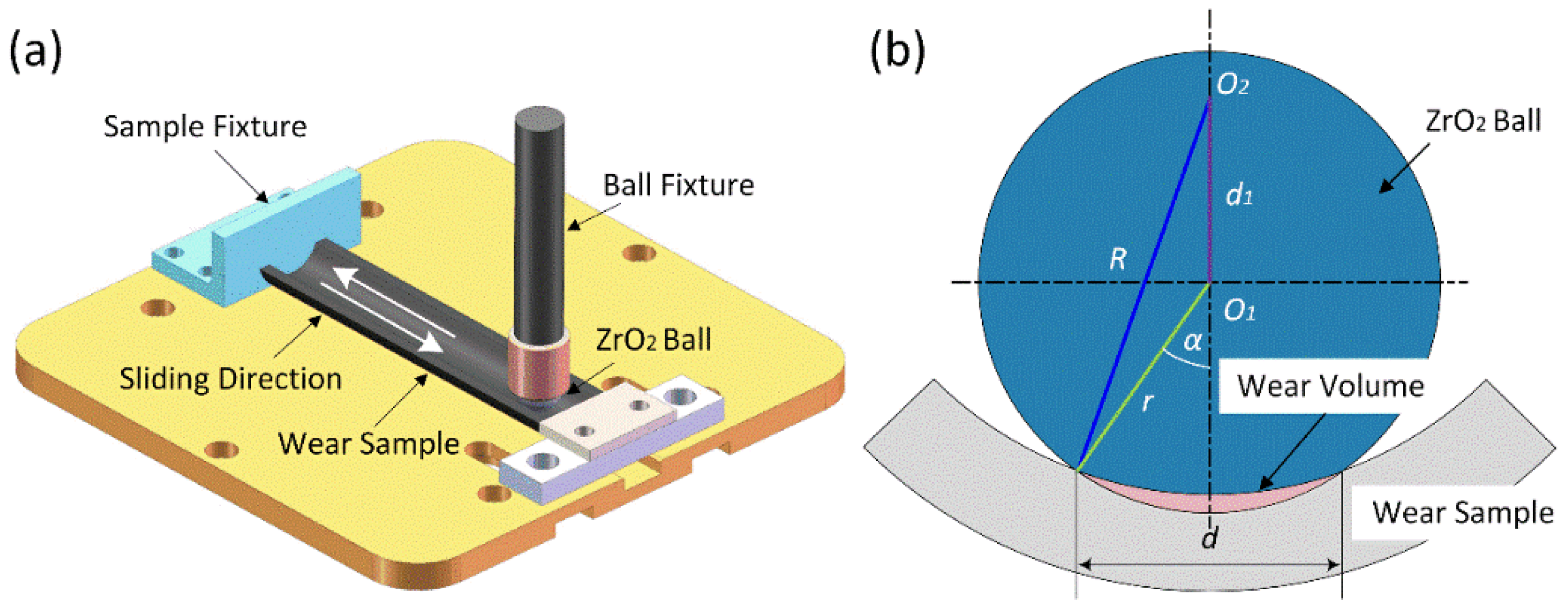 To assess the tribological characteristics of the substrate and the coating, friction and wear tests were carried out using a ball-on-plate reciprocating tribometer (MFT-5000, RTEC, San Jose, CA, USA). This instrument continuously monitored and automatically recorded the friction coefficients (FCs) throughout the testing process. The tubes were sliced along their axial direction to create the necessary friction test specimens. An 8 mm diameter ZrO2 ball was chosen as the counter-body, and the tribological tests were conducted in a ball-on-arc configuration, as illustrated in Figure 3a. The testing conditions were set to a constant temperature of 20 °C, with a constant load (P) of 25 N, a sliding distance of 10 mm, a sliding speed (v) of 5 mm/s, and a sliding duration (t) of 1800 s. The wear volume of the specimens was approximated as a spherical cap, as depicted in Figure 3b. The wear rate W (mm3/N·m) of the specimens was calculated according to Equations (1) and (2):