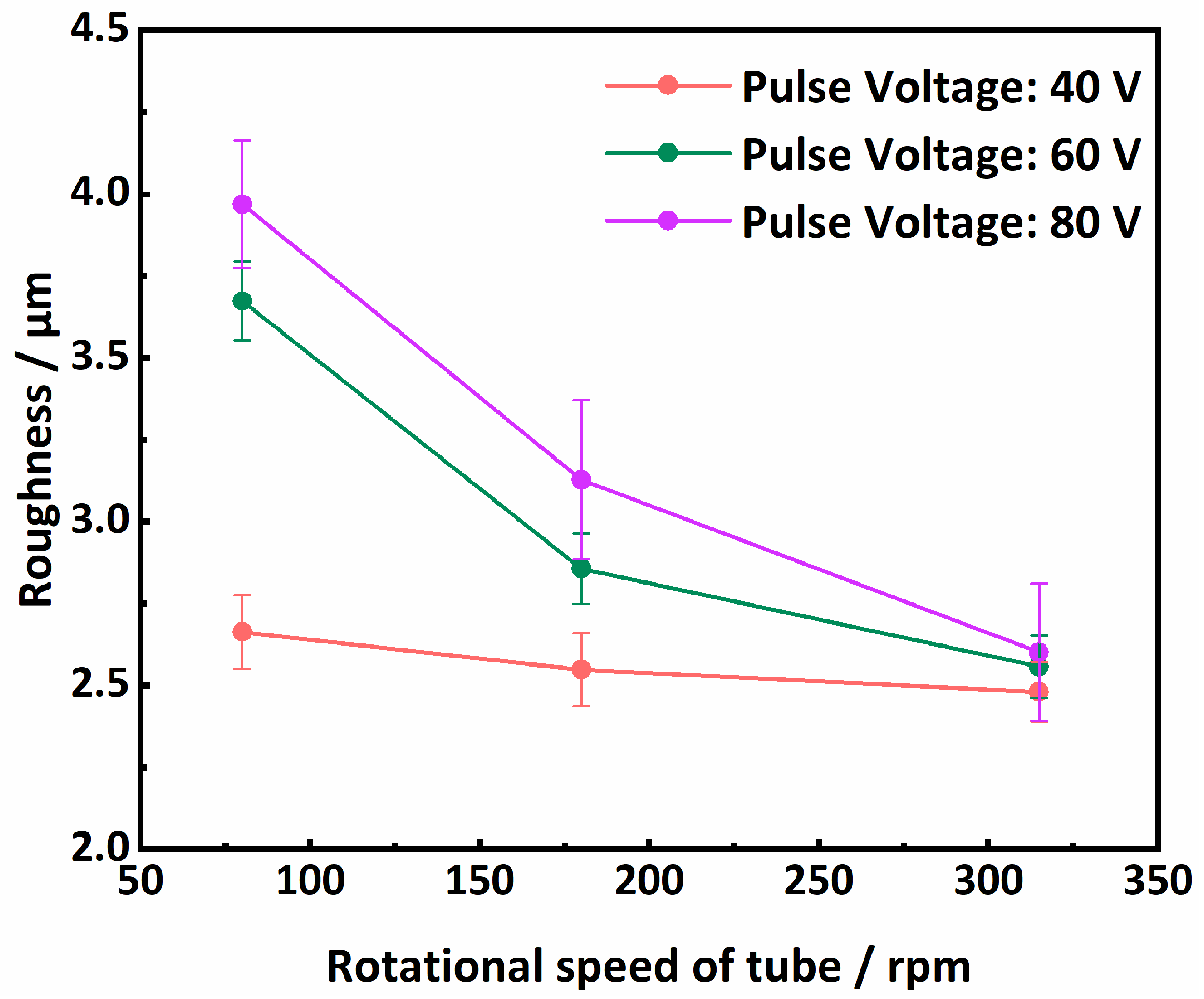 where n is the fraction of capacitor discharge that occurs during arcing. As indicated by Equation (3), PV exhibits a positive correlation with pulse energy, with the influence being more significant than that of capacitance. An elevation in pulse voltage correspondingly augments the single-pulse energy, thereby furnishing the plasma channel with a greater quantum of energy. However, this also amplifies the impact force exerted by the plasma channel on the powder layer, thereby inducing a more pronounced splashing effect and, as a consequence, a rougher coating surface. Conversely, within the interior of the tube, an increase in tube rotation implies that the energy coverage area of the plasma channel per unit time is correspondingly augmented, which effectively reduces the energy density of the plasma channel. This, in turn, mitigates the splashing phenomenon to a certain extent, thereby leading to a reduction in the surface roughness of the coating.