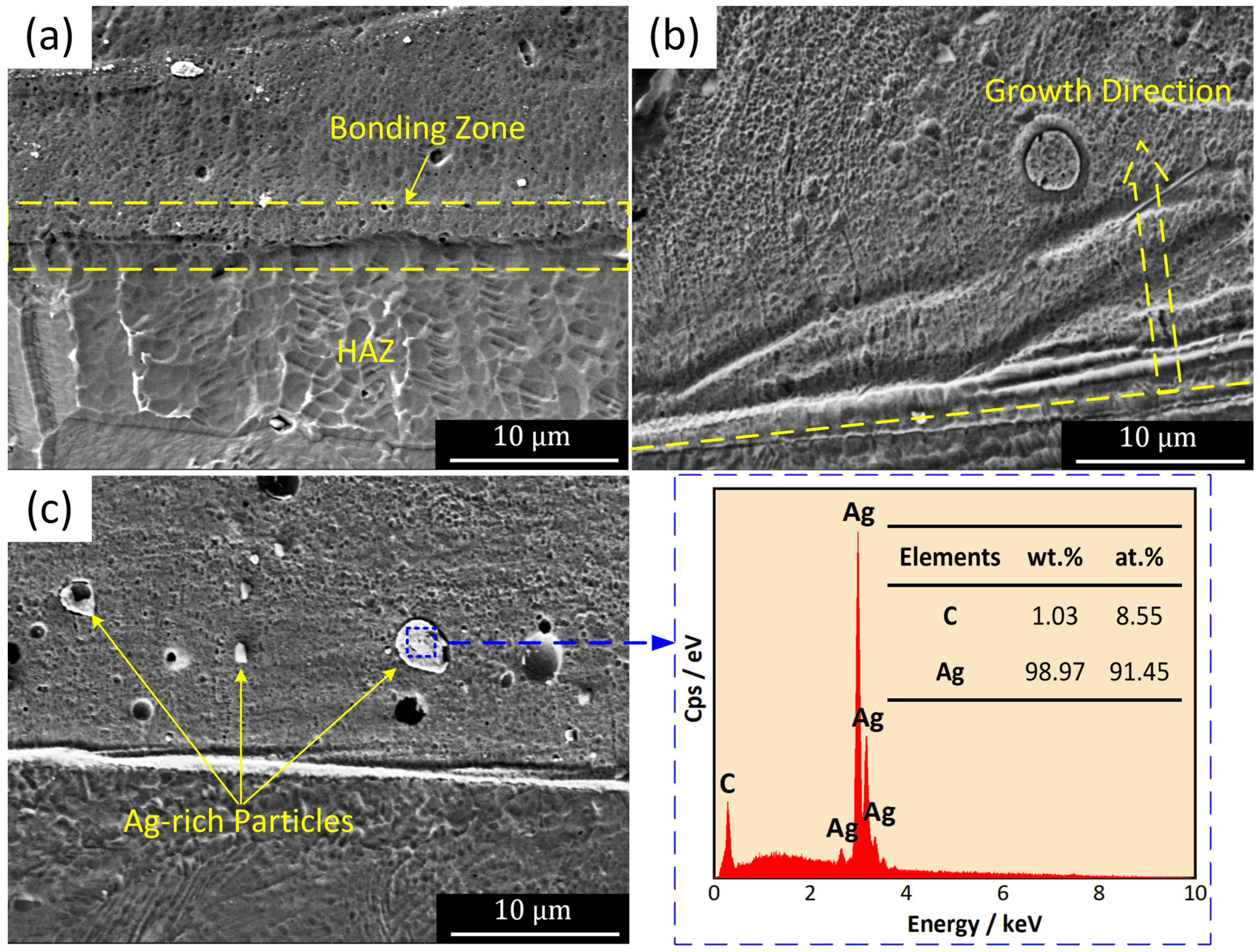 Figure 11. Micrographs of the CEPD coating—(a) bonding zone; (b) grain direction; (c) Ag-rich particles—and EDS results.