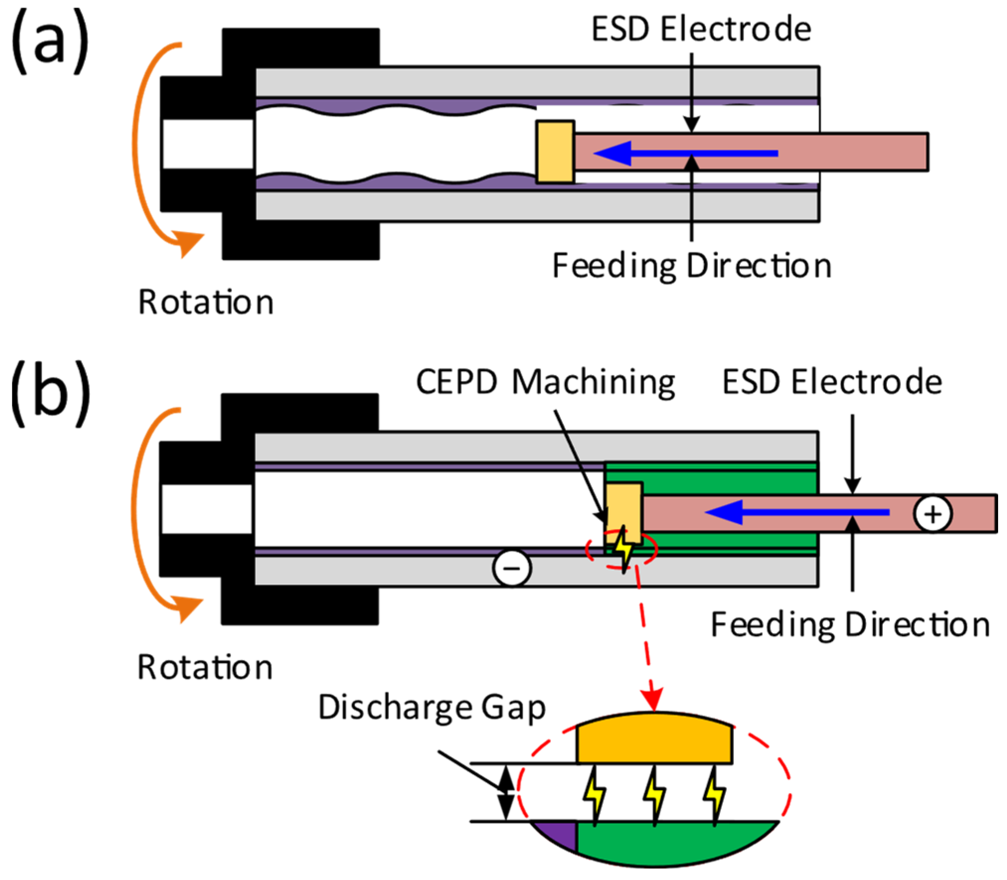 Prior to CEPD processing, the tube with the pre-prepared powder layer is securely clamped in a fixture. The CEPD electrode initially traverses the processing trajectory in a non-discharged state, serving two critical functions: first, to ensure the uniformity and flatness of the powder layer; and second, to maintain a consistent gap between the electrode and the powder layer, as depicted in Figure 14a. Subsequently, the electrode and the tube are connected to a pulse power supply. The electrode is then driven into the interior of the tube by the motion mechanism, and the process parameters are adjusted to initiate the discharge processing, as shown in Figure 14. It should be noted that the discharging gap between the electrode and the powder layer must be precisely controlled. During the CEPD process, the electrode, under the combined influence of axial feed and tube rotation, executes discharge processing on the inner surface of the tube in a spiral trajectory, ultimately forming a continuous coating over the entire inner surface.