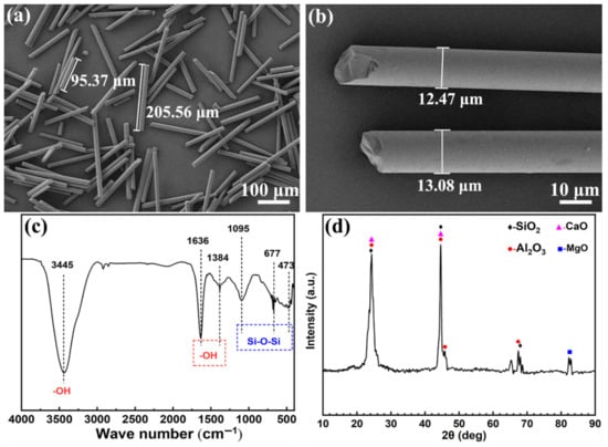 Surface morphologies of (a) basalt fibers at low magnification: 100× and (b) basalt fibers at high magnification: 1000×. (c) FT-IR spectrum of basalt fibers. (d) XRD spectrum of basalt fibers. Reprinted from Ref. [28] with permission from Elsevier.