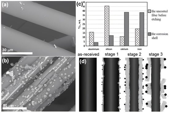 In the material composition of the BF surface, the mass ratio of acid oxide SiO2 is about 50 wt.%, which means that the BF surface could be eroded by alkali. Baklanova et al. [29] found that raw BFs could be eroded by alkali solution with concentration of 2.0 mol/L at ambient temperature during a definite period of time (8, 16, 32, and 64 days), and the main substance corroded off the BF surface was SiO2, where the corrosion went through three stages, which were corrosion of shell, mechanical stress concentration at the interface, and finally exfoliation of the broken-shell, as seen in Figure 2a,c,d. They have also concluded that zirconia coating could improve corrosion resistance of BFs in alkali solution, as seen in Figure 2b.