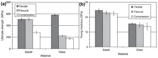 Comparison of tensile, flexural, and compressive properties between basalt and E-glass fiber composites of (a) ultimate strength and (b) Young’s modulus. Reprinted from Ref. [44] with permission from Elsevier.