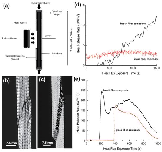 BFs have a high resistance to elevated temperatures, making them suitable for applications where exposure to heat is a concern, which is particularly advantageous in industries such as aerospace, automotive, and fire-resistant materials [49,50]. Mouritz et al. [51] studied the fire resistance and high temperature resistance of BF with the device in Figure 4a; the out-of-plane deflections of the samples were measured using a linear variable differential transformer (LVDT) attached to the back surface. The result found that the BF laminate released heat sooner and showed obviously higher values than the GF laminate, meaning that BF showed a bigger heat release rate, as seen in Figure 4d,e. And the rapid heat release ensured better structural stability of BF, showing slight buckling, as shown in Figure 4b,c. Overall, the impressive thermal properties of BFs make them a valuable material in various sectors, ranging from aerospace and automotive engineering to construction and manufacturing.