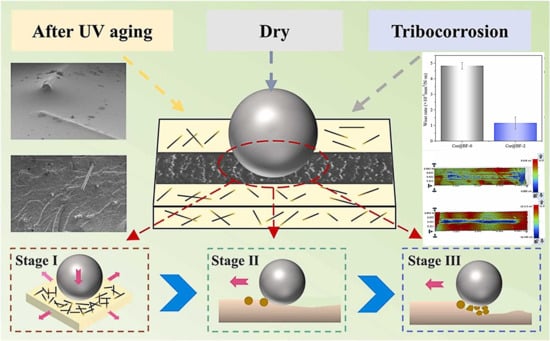 While they may provide a degree of protection, their mechanical strength may be limited. As for BF-reinforced composites, the incorporation of BFs significantly enhances mechanical strength. The fibers act as a reinforcement, improving the overall structural integrity of the composite, which makes BF-reinforced composites more robust and resistant to mechanical stresses [52,53]. As shown in Figure 5, Fan et al. [54] verified that evenly dispersed BFs can offer the interior/exterior enhancement under drying, corrosion, and UV aging, and the epoxy composite coating with 2 wt.% BFs performed the optimal tribological properties, in which the wear rate after friction in brine was reduced by 76.03% as compared with pure epoxy.