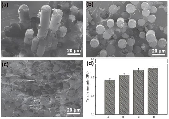 Wei et al. [55] studied the tensile strength of BF-reinforced epoxy composite coating and found that BF significantly improved the tensile strength of composite coating. However, the BFs without surface treatment were agglomerated inside the coating, as shown in Figure 6a, and the coating of SiO2 nanoparticles helped to improve the dispersion of the fibers and enhance the fiber/resin interface properties, as shown in Figure 6b,c. The increase in dispersibility and interfacial compatibility of the fiber further improved the tensile strength of the composites, as seen in Figure 6d.