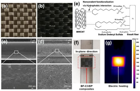 Digital images of (a) basalt fibers and (b) MWCNT-coated basalt fibers. SEM images of the (c) raw and (d) MWCNT-coated basalt fiber. (e) Illustration of the interactions between basalt fibers and MWCNT. (f) Digital and (g) infra-red images of basalt fibers epoxy composite. Reprinted from Ref. [58] with permission from Elsevier.