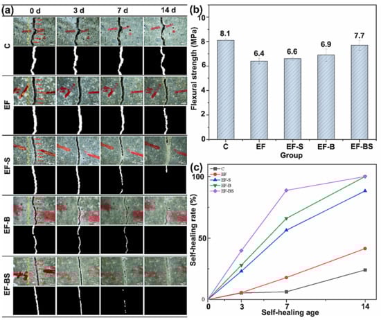 BFs enhance the flexibility of composites, making them more resistant to cracking, which is particularly advantageous in applications where flexibility and durability are crucial, such as in construction or infrastructure projects [59]. Wang et al. [60] reported that modifying the BFs with nano-SiO2 contributed to enhancing the interfacial compatibility between modified BFs and mortars, leading to BF-based mortars performing the obvious anti-cracking and even crack-healing abilities, as seen in Figure 8a,c. The experiment included five groups of mortar specimens, labeled C, EF, EF-S, EF-B, and EF-BS. C represents the control group of mortar specimens. The specimens with added expanded perlite and unmodified basalt fibers were named EF. In the EF-S specimens, expanded perlite and modified basalt fibers were added. EF-B represents specimens with added bacterial healing agents and unmodified basalt fibers. EF-BS indicates specimens with added modified basalt fibers and self-healing agents. All the mixtures had a water–cement ratio of 0.5 (W/C = 0.5). Also, the flexural strengths of BF-based mortars have increased with the help of tensile strength and elasticity modulus of BFs, as seen in Figure 8b.
