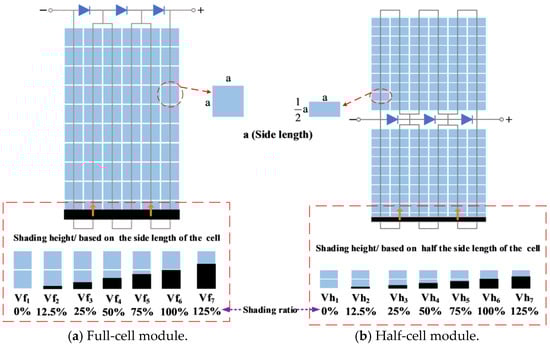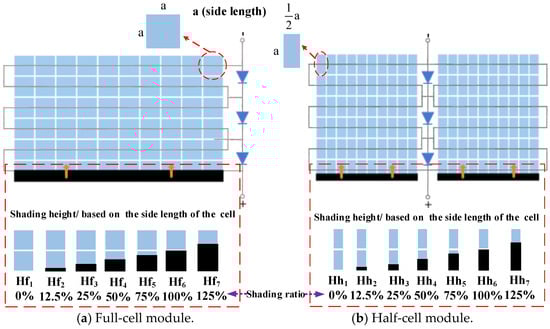 Both full-cell and half-cell modules were tested under two shading configurations—vertical shading (along the short edge) and horizontal shading (along the long edge)—simulating the edge shading effects caused by dust under different installation conditions. All tests were performed under STC, with only the shading configuration being varied. Shading strips with height ratios of 0%, 12.5%, 25%, 50%, 75%, 100%, and 125% were applied to the surface of the photovoltaic modules, resulting in seven distinct scenarios. The shaded area is completely opaque, meaning it receives no light. A shading ratio of 0% indicates no obstruction, while 12.5% corresponds to a shading height equal to 0.125 times the side length of the solar cell. The remaining cases follow the same proportional relationship. When there are no shading strips, the main electrical parameters of the tested full-cell and half-cell modules are listed in Table 1. The deviations from the nameplate values are within 3%, demonstrating good agreement between the test results and the nominal specifications provided by the manufacturer. The detailed layout and dimensions of the shading strips are illustrated in Figure 4 and Figure 5 and summarized in Table 2. In this study, the height of the shading strips is set based on the side length a of the full cell. For the half-cell, the length along the long side is a, while the length along the short side is a/2.