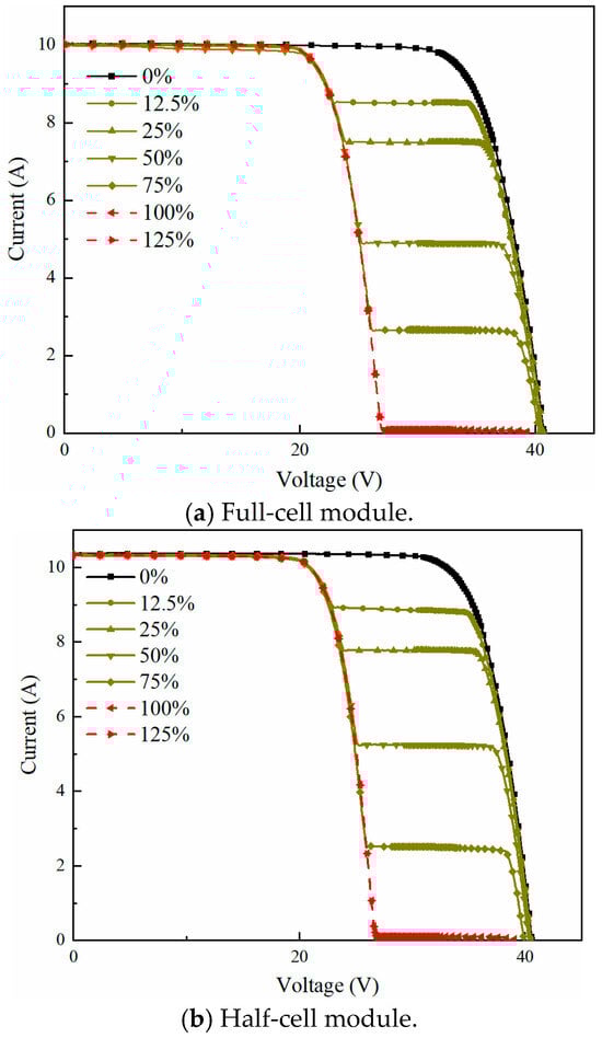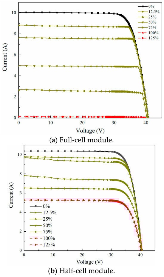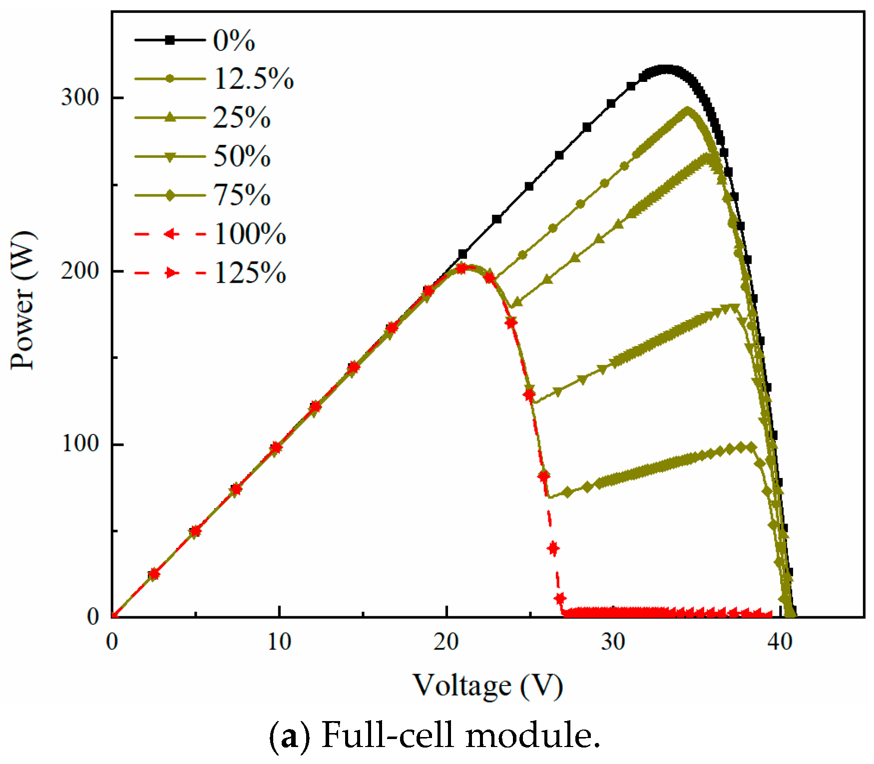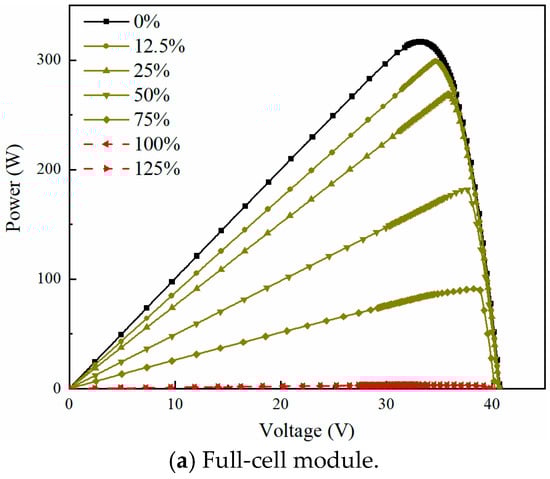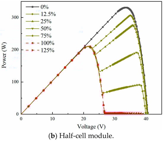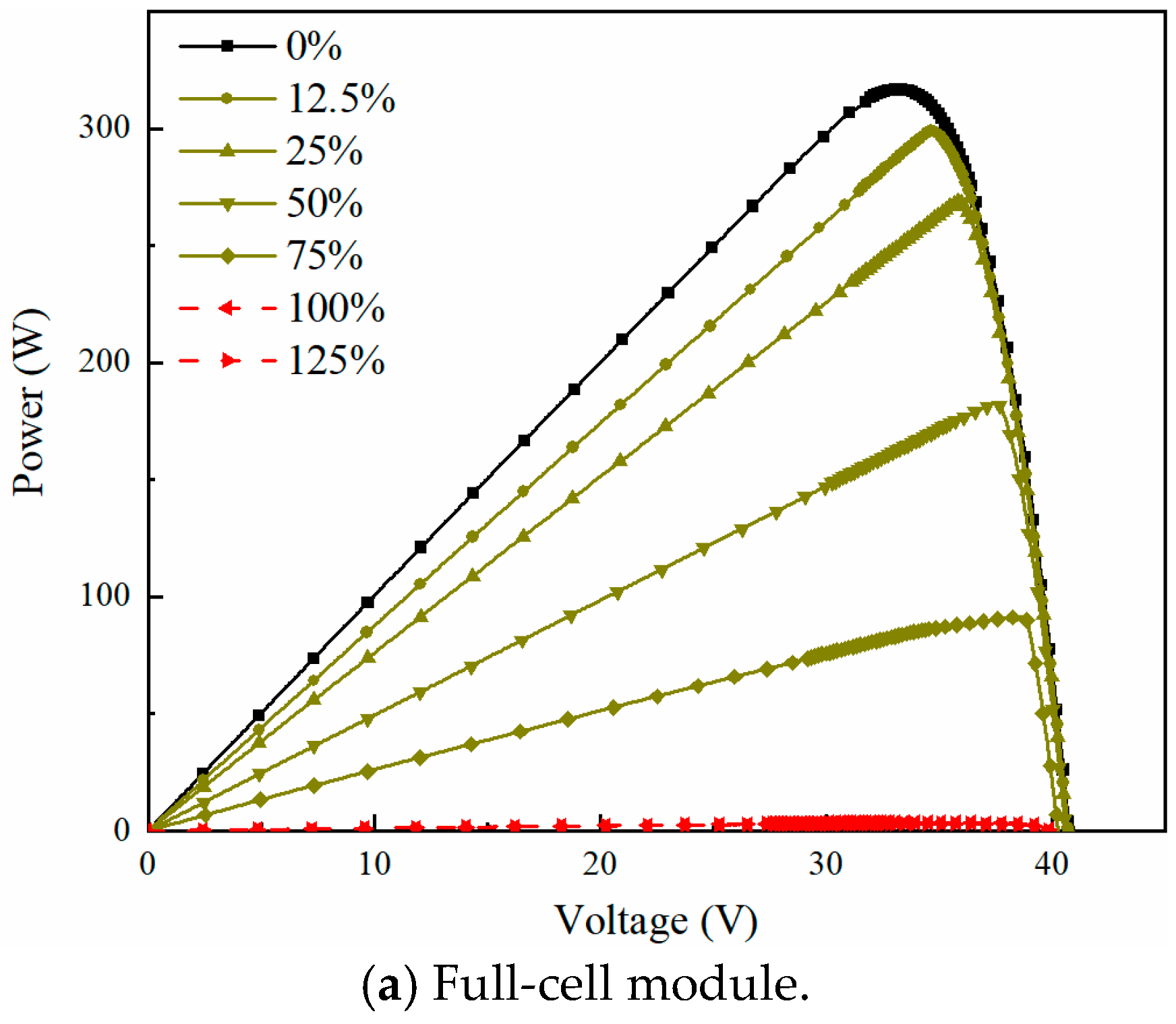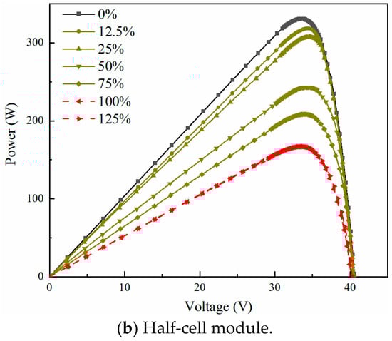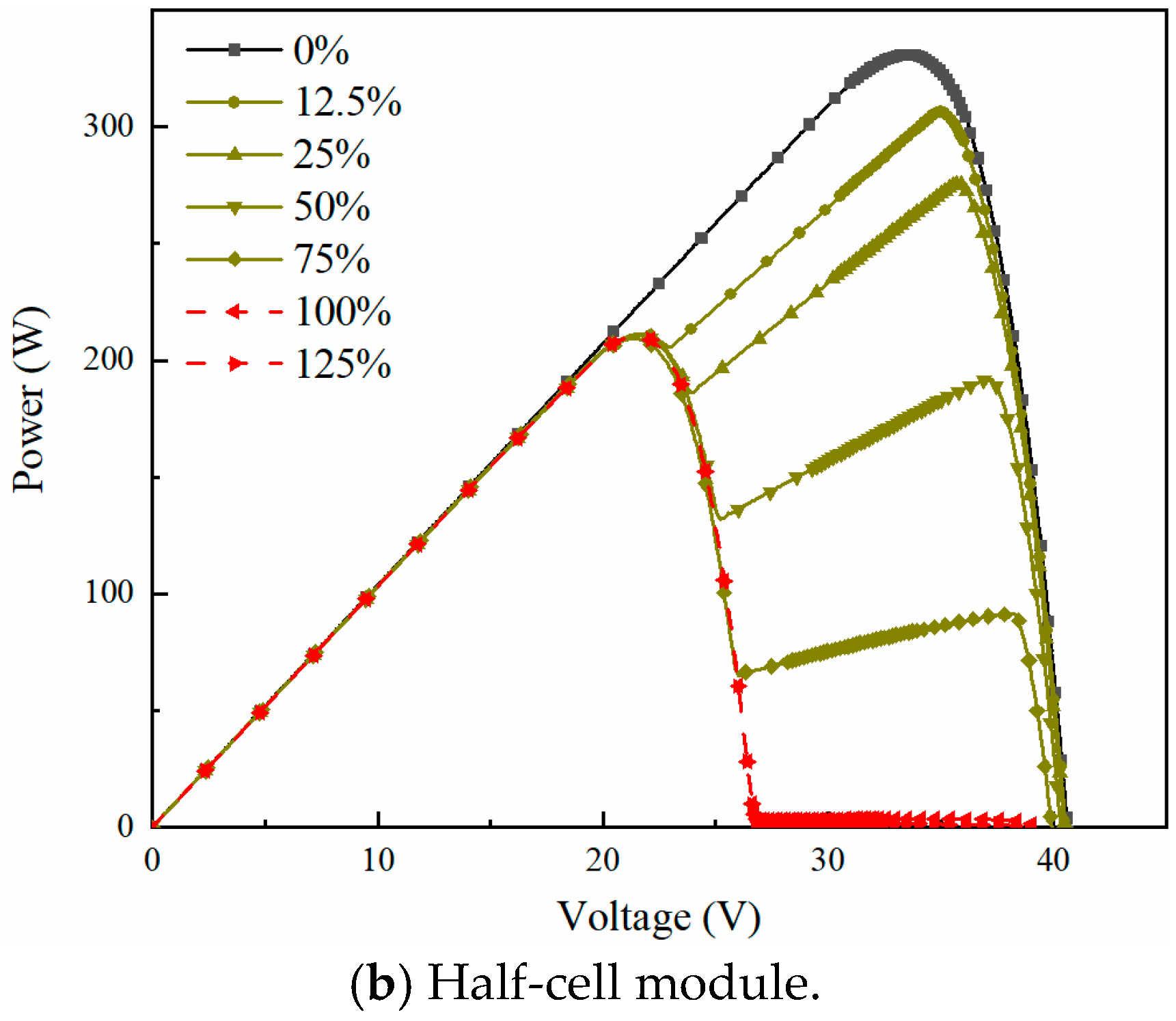 The actual layout of PV arrays is often constrained by factors such as available space, terrain, and land-use efficiency, which may necessitate horizontal installation configurations. For this installation configuration, a corresponding shading strip scheme was developed, as illustrated in Figure 5. The test results under this shading condition are summarized in Table 4 and Figure 8 and Figure 9. Without shading strips, the maximum output power of the full-cell and half-cell modules is 316.75 W and 330.88 W, respectively. When the shading ratio reaches 12.5%, the global maximum power drops to 292.48 W for the full-cell module and 306.33 W for the half-cell module, with power losses remaining within 8%. As the shading ratio increases to 25%, the output power further declines to 265.07 W and 275.76 W for the full-cell and half-cell modules, respectively, corresponding to an approximate attenuation of 16%.