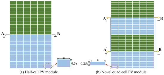 Front-view schematic for the structure of the half-cell and quad-cell PV modules.