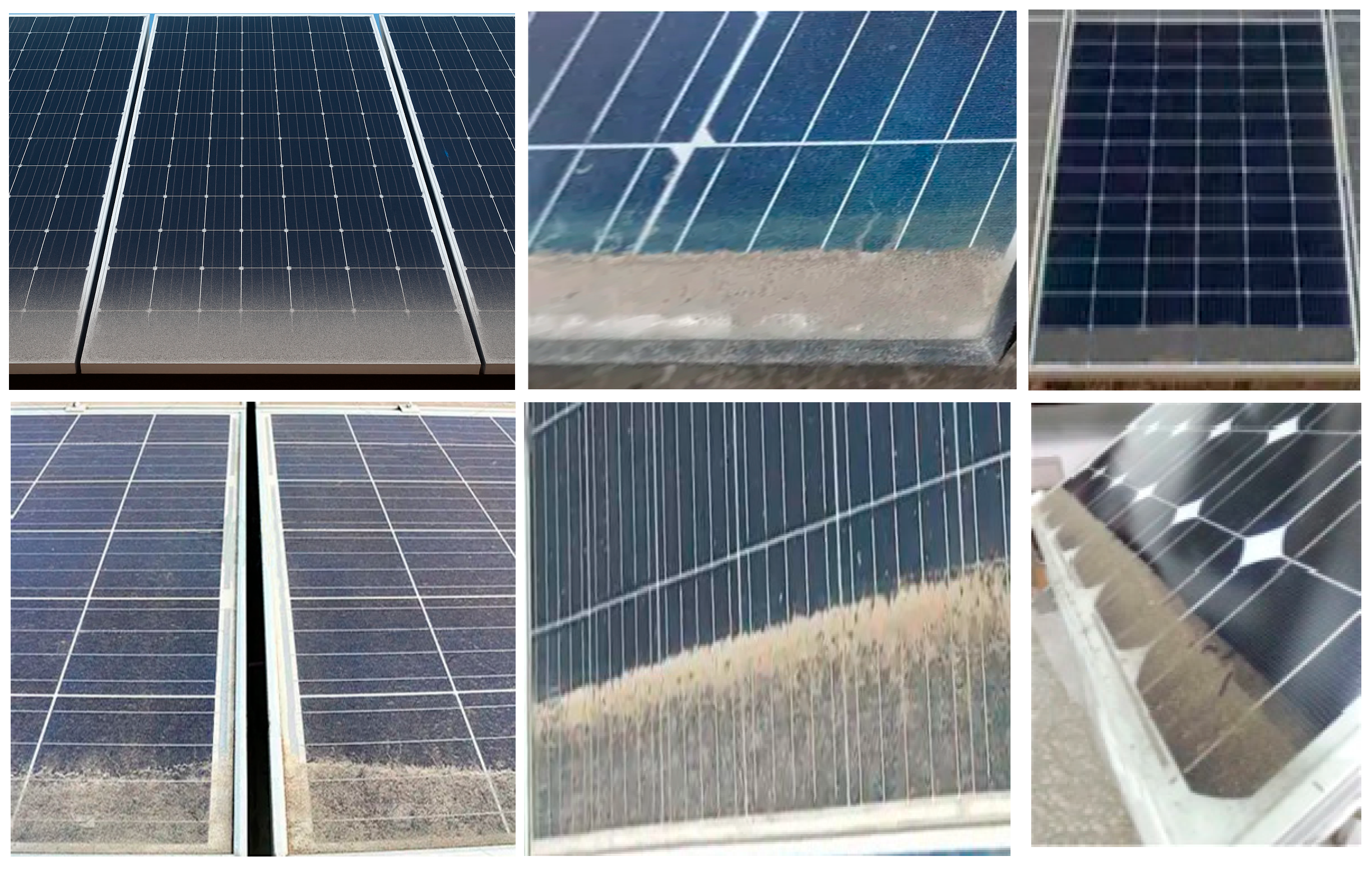 The cleanliness level of PV module surfaces directly affects their power generation efficiency, with the edges of modules becoming dead zones for dust accumulation. Figure 2 illustrates real-world surface conditions of several PV modules. Even though large-scale PV power plants conduct regular manual or mechanical cleaning, extremely hard-to-remove dust remains on the edge areas. For small-scale PV systems without automatic cleaning, the surface cleanliness issue is even more prominent. For the long-uncleaned PV arrays (module strings) shown in Figure 2, their power generation capacity is severely impaired. However, there are few reported studies on the design and optimization of systematic experimental schemes targeting dust shading issues at the edges of modules with different structures.