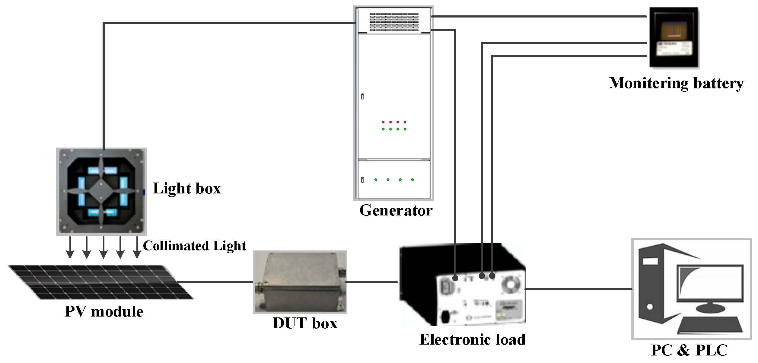 The experiment was carried out using the PASAN High LIGHT system developed by Meyer Burger. The irradiance was 1000 W/m2, the ambient temperature was 25 °C, the spectrum referenced the ASTM G173-03 standard [39], and the wind speed was 0 m/s for the experiment, which fully satisfy the STC testing standard. The layout of the testing system is illustrated in Figure 3. The system primarily comprises a light source chamber, light source power supply, electronic load, monitoring and control battery, device under test (DUT) test box, and programmable logic controller (PLC).