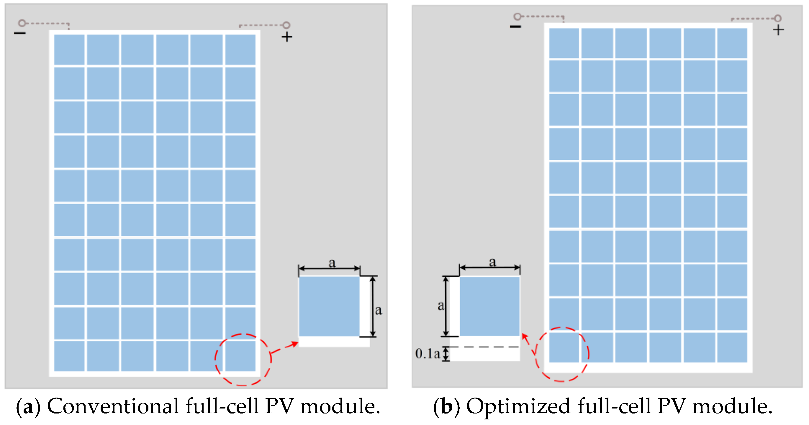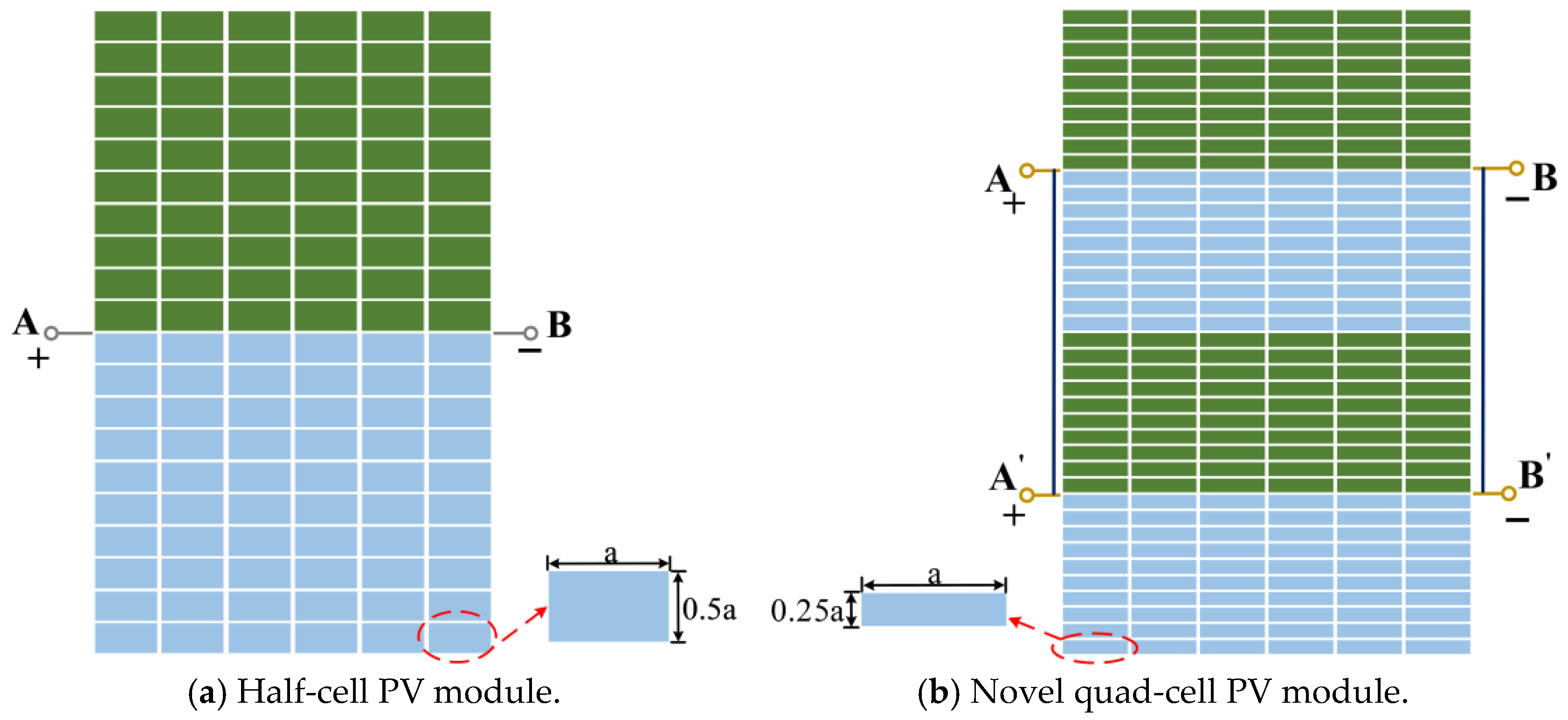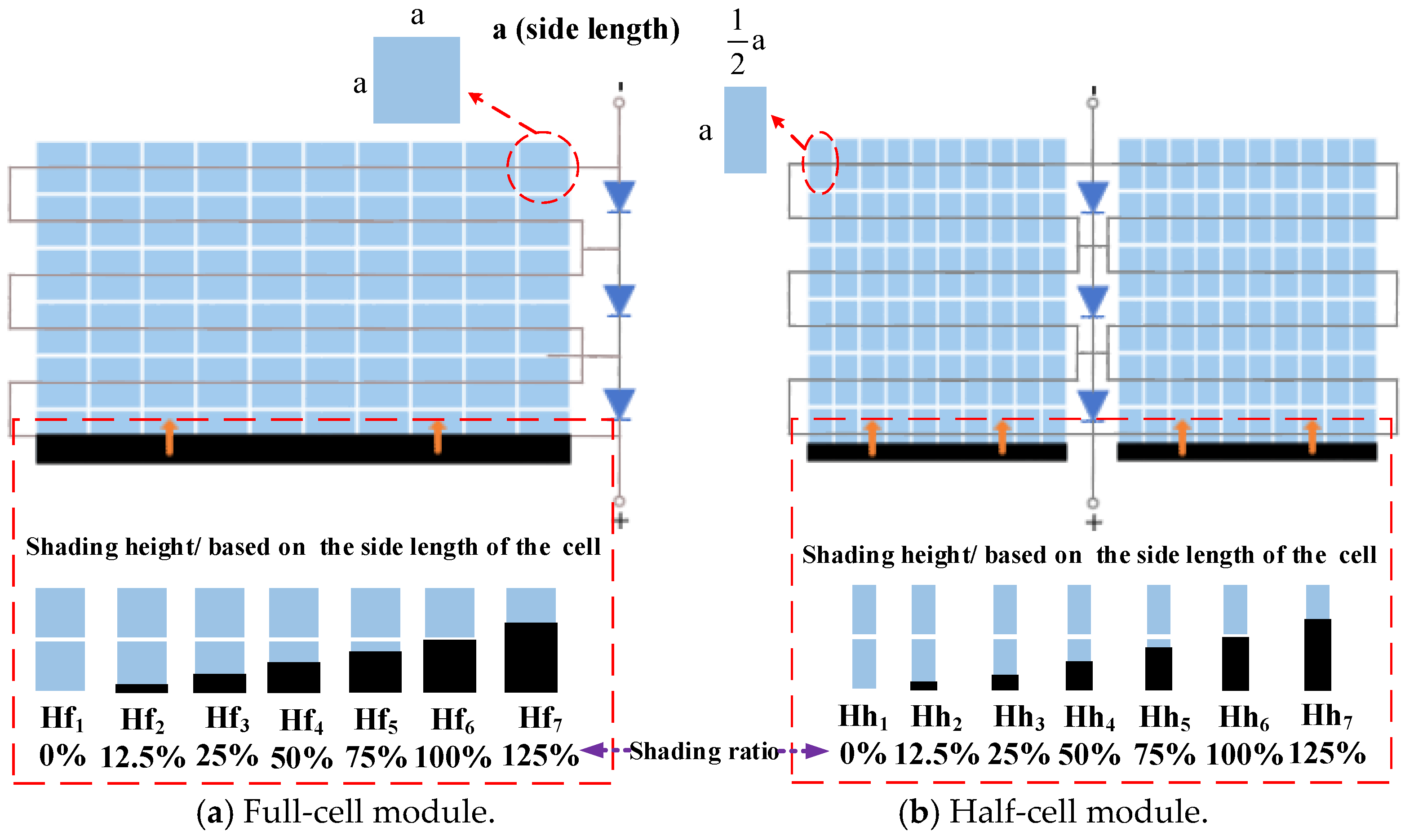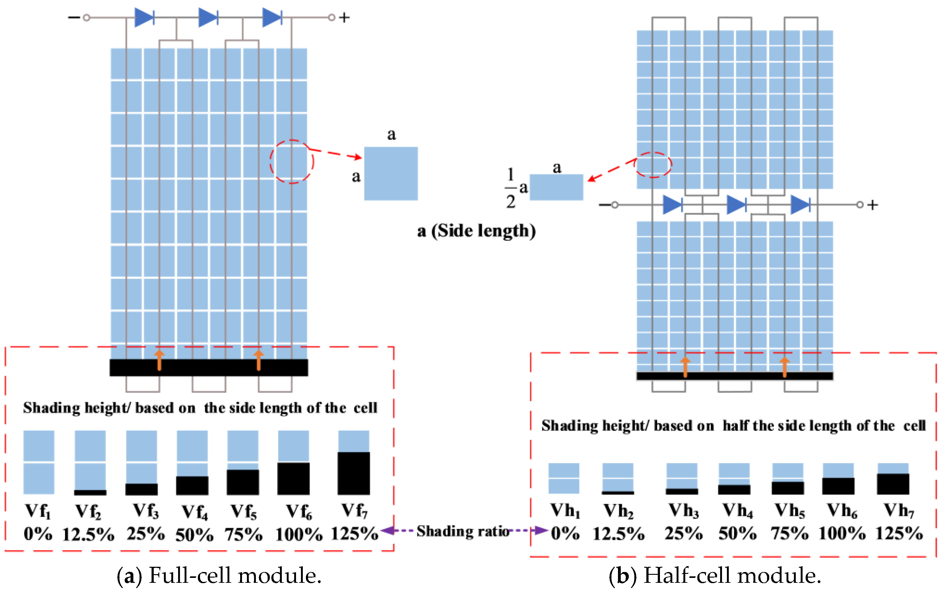 Since the large-scale application of photovoltaic, PV, modules, extensive attention has been paid to research on the impacts of shading on module performance and their underlying laws. For instance, studies have shown that building or environmental shading may induce hotspots and affect module reliability [12], while half-cell modules and different installation methods can effectively mitigate power losses caused by partial shading [18,20]. To address complex shading conditions, researchers have proposed various maximum power point tracking (MPPT) control strategies, including meta-heuristic optimization algorithms [21], generalized pattern search algorithms [22], improved PS-FW algorithms [23], hybrid MPPT techniques [24], comparisons of single/multi-MPPT structures [25], and optimized applications in grid-connected systems [26]. These studies demonstrate that there exists a significant coupling effect between module structure, installation method, and control strategy under shading conditions. Among these factors, the internal electrical interconnection scheme of the module is the core determinant of output performance and shading sensitivity, playing a crucial role in achieving systematic optimization, improving power generation efficiency, and enhancing long-term stability. In conventional full-cell modules, all cells are connected in a single series string; when a cell is shaded, the bypass diode may be activated, leading to a sharp drop in output voltage [27,28,29]. In contrast, half-cell modules incorporate two parallel circuits, which effectively suppress the negative effects of shading on output performance. Significant reductions in power loss and mitigation of hotspot effects have been observed in half-cell configurations under a wide range of shading scenarios [12,18]. In practical applications, the impact of installation direction on the performance of PV modules is also a critical research topic [17,20]. The effects of shading vary considerably between horizontal and vertical installations, exhibiting distinct impact patterns under different directions [30,31]. Academic and industrial communities have also conducted extensive explorations into multidimensional strategies such as multi-busbar cells, distributed bypass diodes in modules, and micro-inverters integrated with modules. For instance, shingled solar modules significantly enhance output under partial shading and reduce hotspot risks through series/matrix interconnection structures [30]. The design of low-cost, large-area bifacial interdigitated back-contact (IBC) solar cells with a front-floating emitter optimizes power losses under complex shading conditions [32]. Modeling of half-cell modules and analysis of bypass diode configurations have demonstrated effective mitigation of output mismatch in shading scenarios [33]. Module-Level Power Electronics (MLPE) systems have improved power distribution and system reliability under local shading conditions [31,34,35]. Distributed power electronics technologies (e.g., submodule-level converters) have almost completely suppressed the hotspot phenomenon [36]. The application of power optimizers in Building-Integrated Photovoltaic (BIPV) systems can significantly reduce shading-induced power losses [37]. Meanwhile, studies on micro-inverters and yield modeling have evaluated the overall system performance under different shading conditions [38].