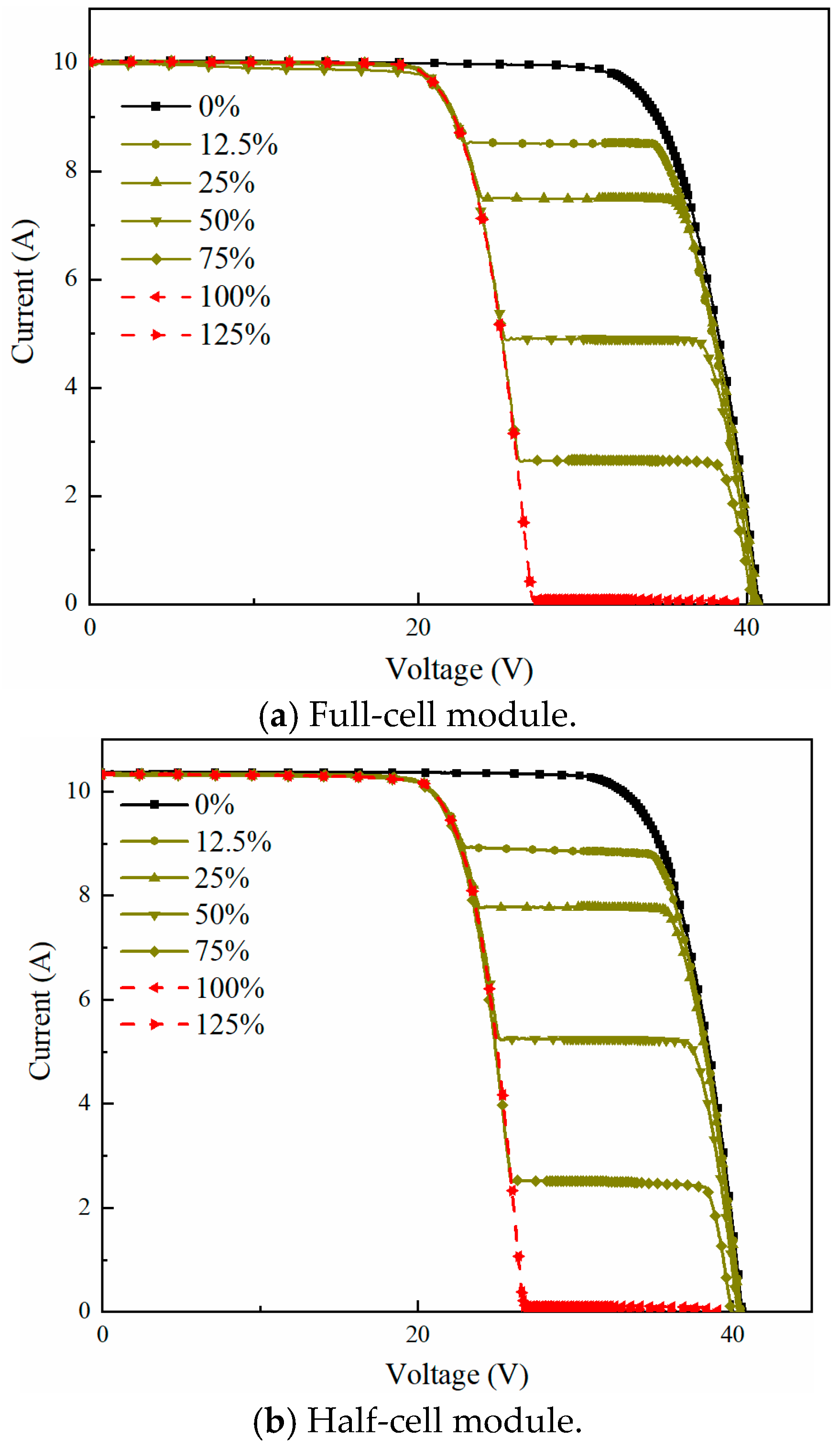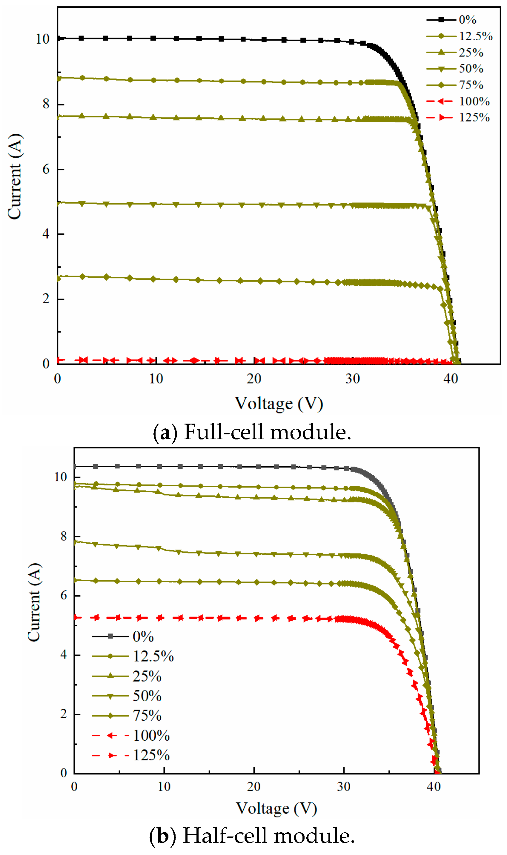 The entire testing process was strictly conducted in accordance with the predefined procedures. Baseline testing was first conducted on the modules without any shading strips, during which the corresponding data were automatically recorded by the system. The PV module was then removed and rearranged with the shading strip. On this basis, the procedure was repeated to collect the new experimental data. Tests were repeated twice at the same shading ratio, with data recorded separately. The data were validated only when the two measurements fell within the error range. To minimize the influence of external factors, the experimental system was automatically configured to compensate for fluctuations in illumination and temperature deviations, ensuring that the results were not affected by parameter variations. As a result, the experimental data were confirmed to be credible, reliable, and reproducible. All data were automatically stored by the testing system and systematically archived according to shading pattern (horizontal/vertical), module type, and shading ratio.