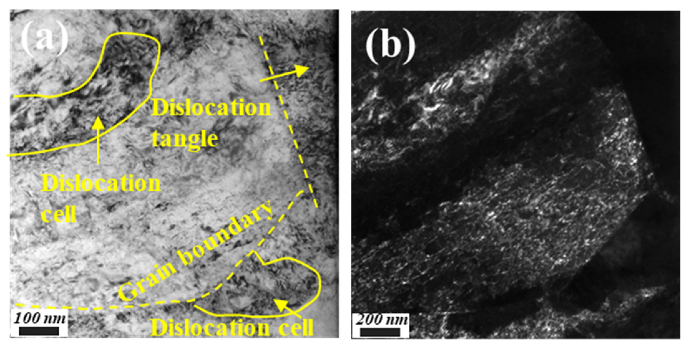 - From the surface to the material interior, the microstructure of the TC6 titanium alloy subjected to LSP treatments exhibited a gradient distribution with increasing depth: nanocrystalline, high dense dislocation, and matrix coarse grains. It was found that dislocation movement is the main reason for the formation of nanocrystalline in the LSP-treated TC6 titanium alloy.