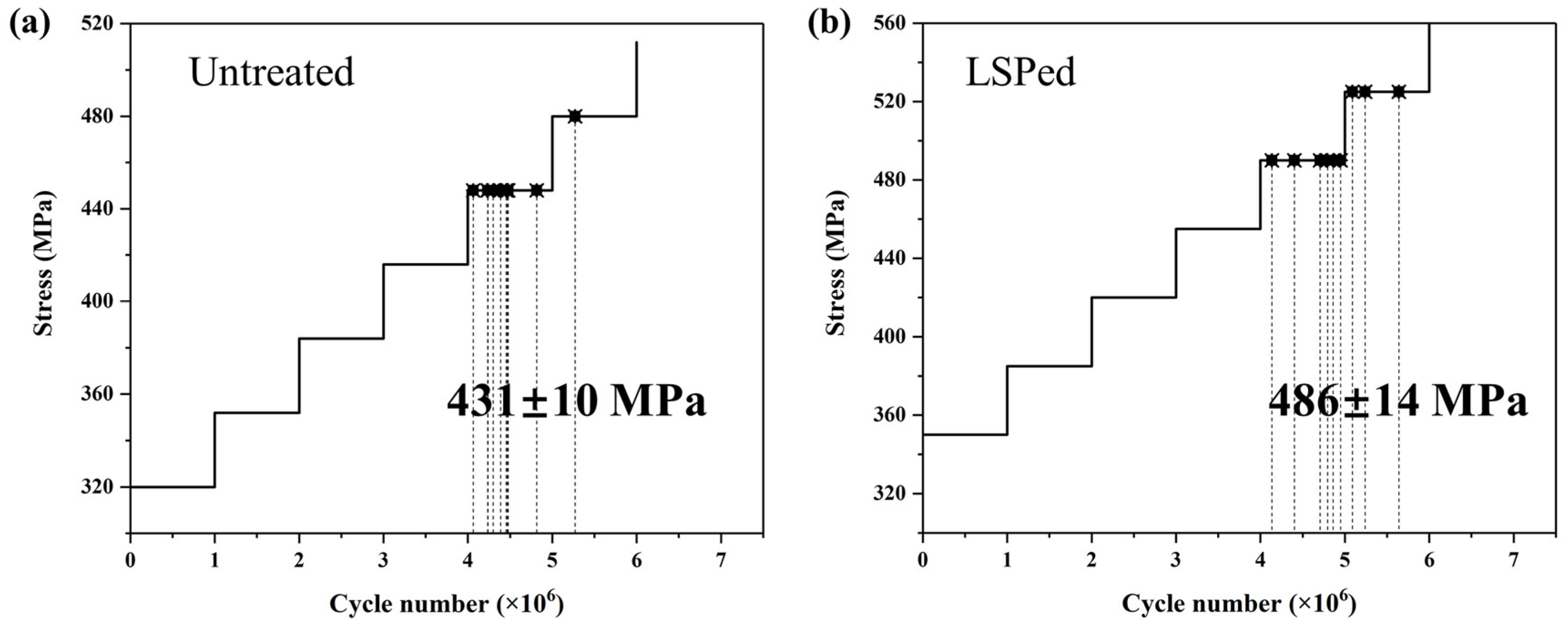 - After LSP, the high-cycle fatigue limit of the TC6 titanium alloy improved from 431 ± 10 MPa to 486 ± 14 MPa, increasing by 12.8%.