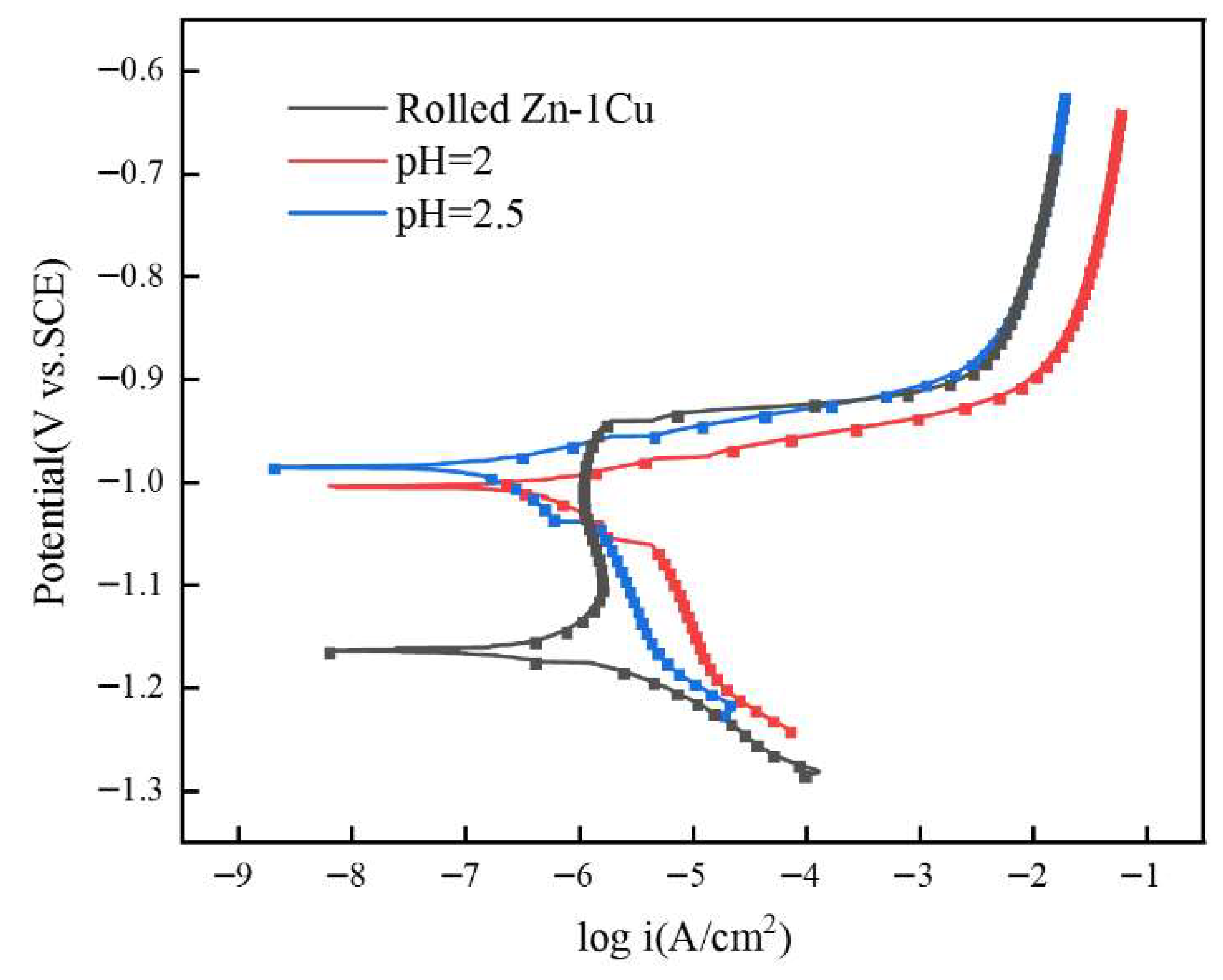 | Rolled Zn-1Cu | −0.98 ± 0.036 | 0.72 ± 0.042 | 10.64 ± 0.017 |