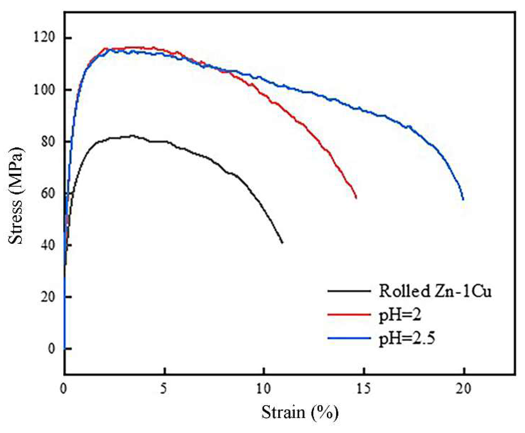 | Rolled Zn-1Cu | 82.83 ± 1.58 | 54.06 ± 1.27 | 10.89 ± 0.29 |