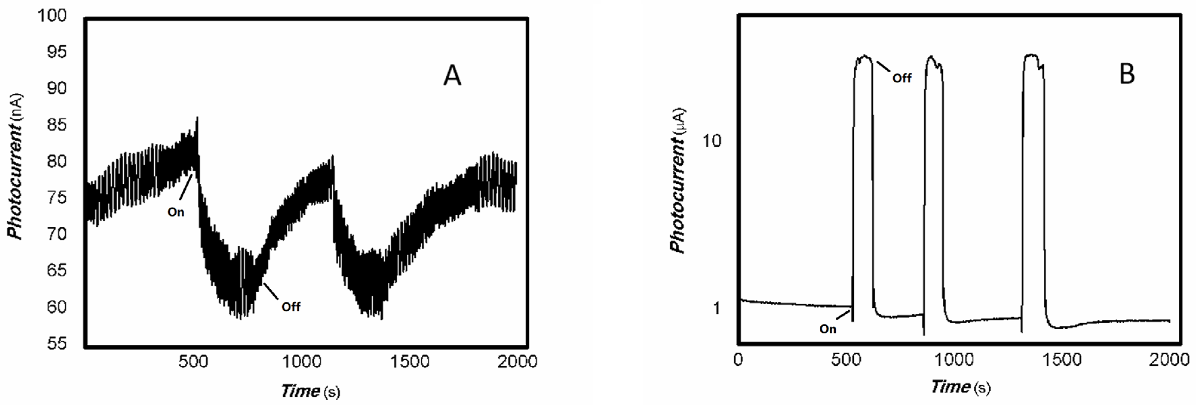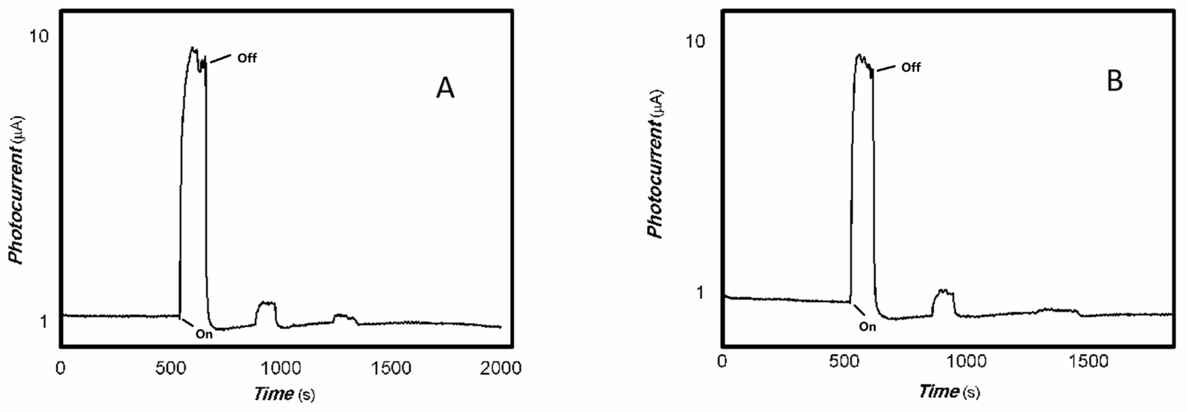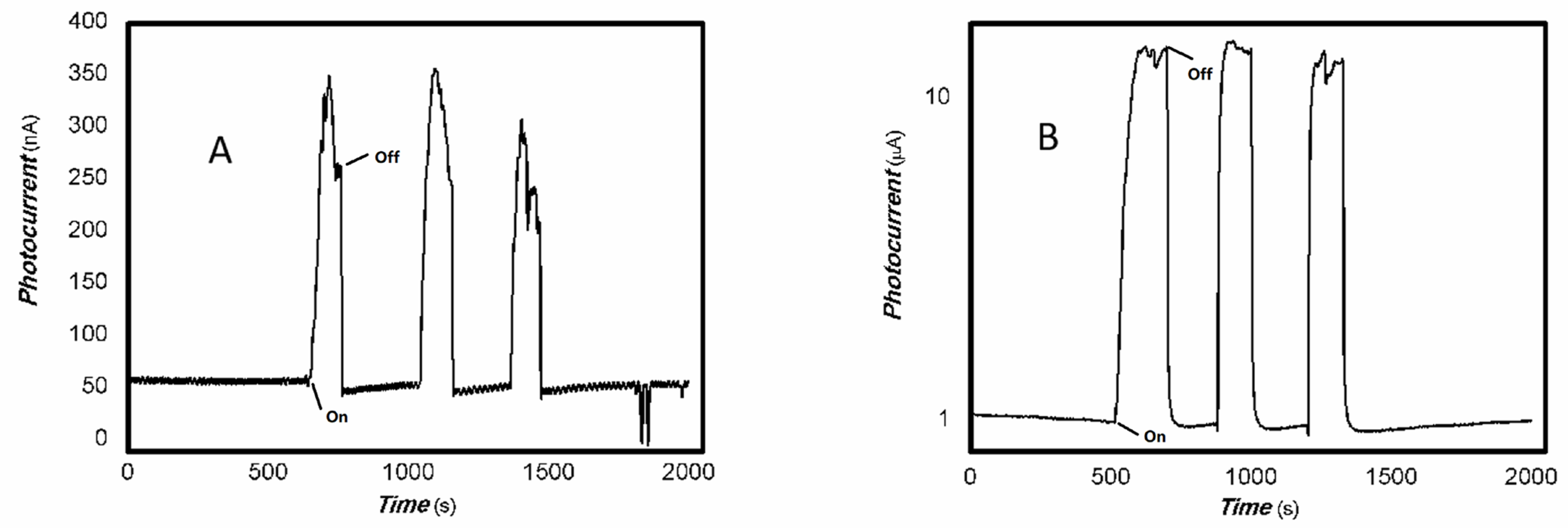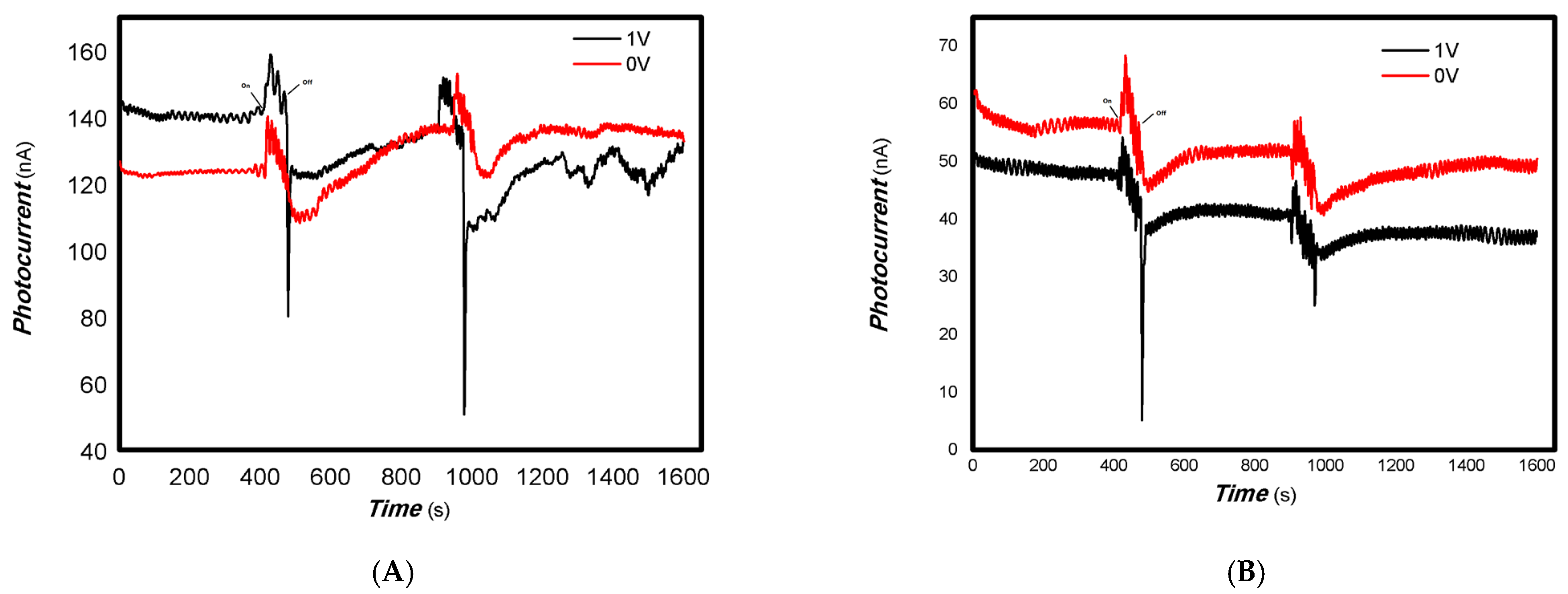 2.7. Photocurrent Response of Nanocomposite to the Visible Light and the NIR