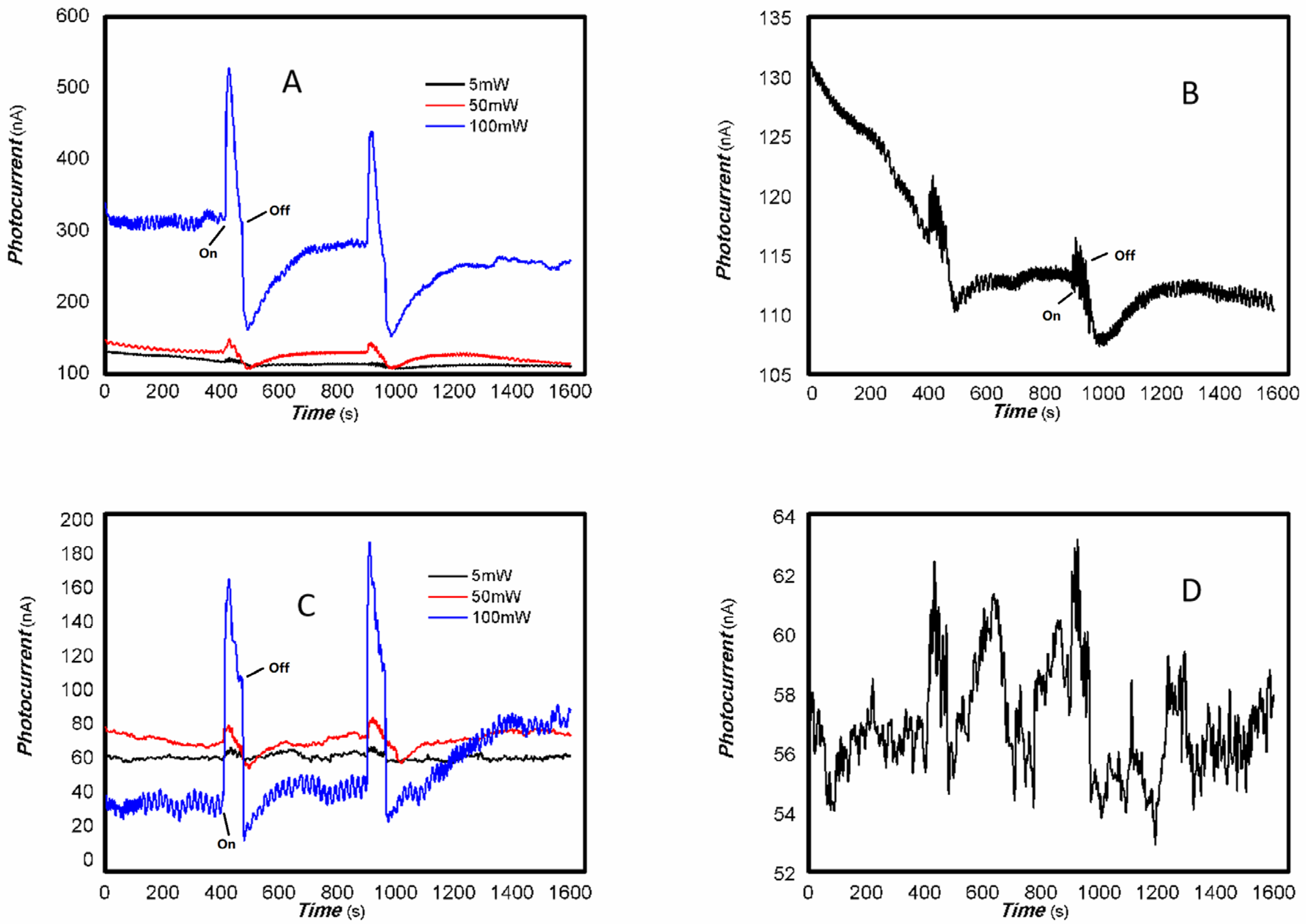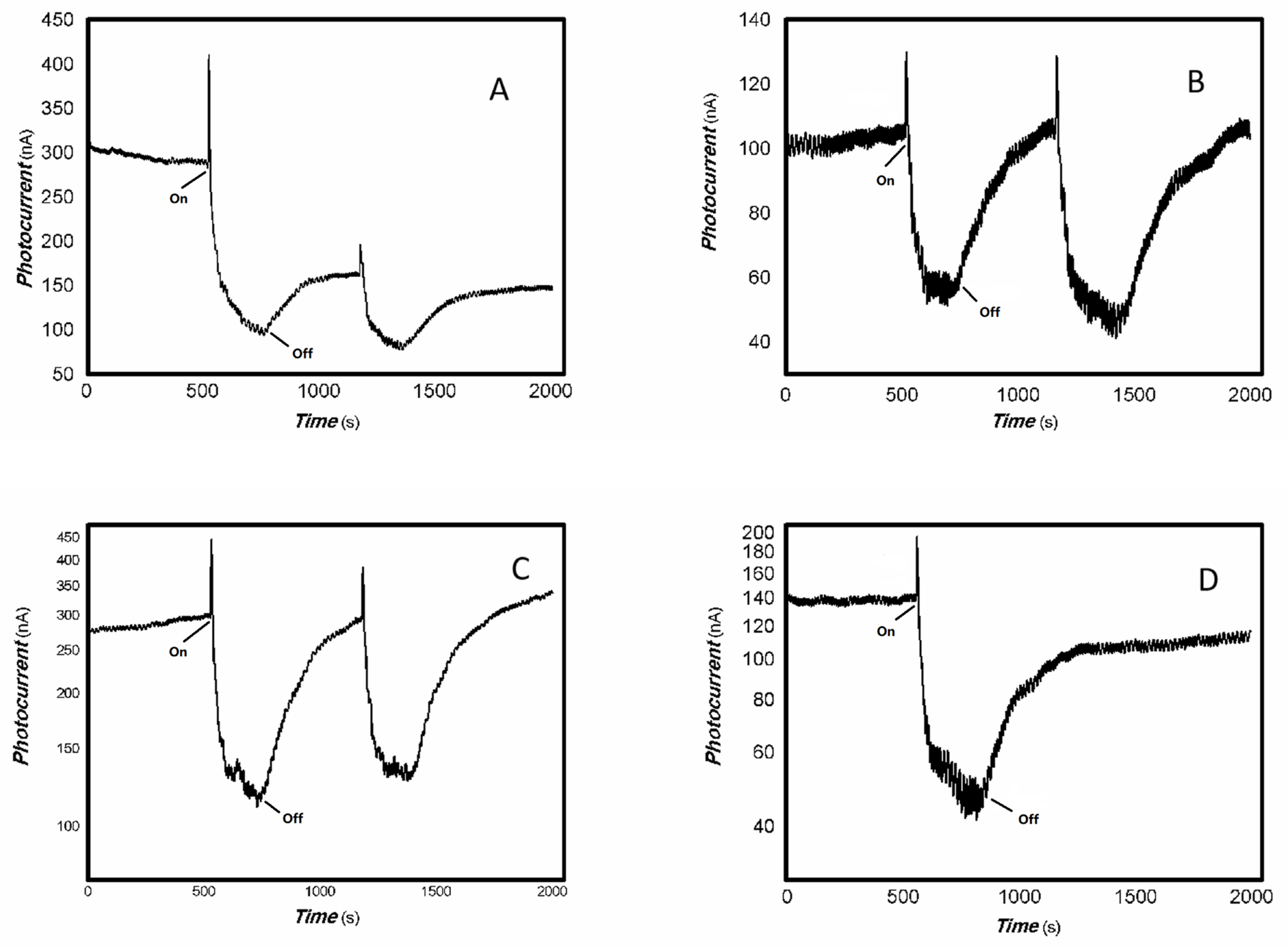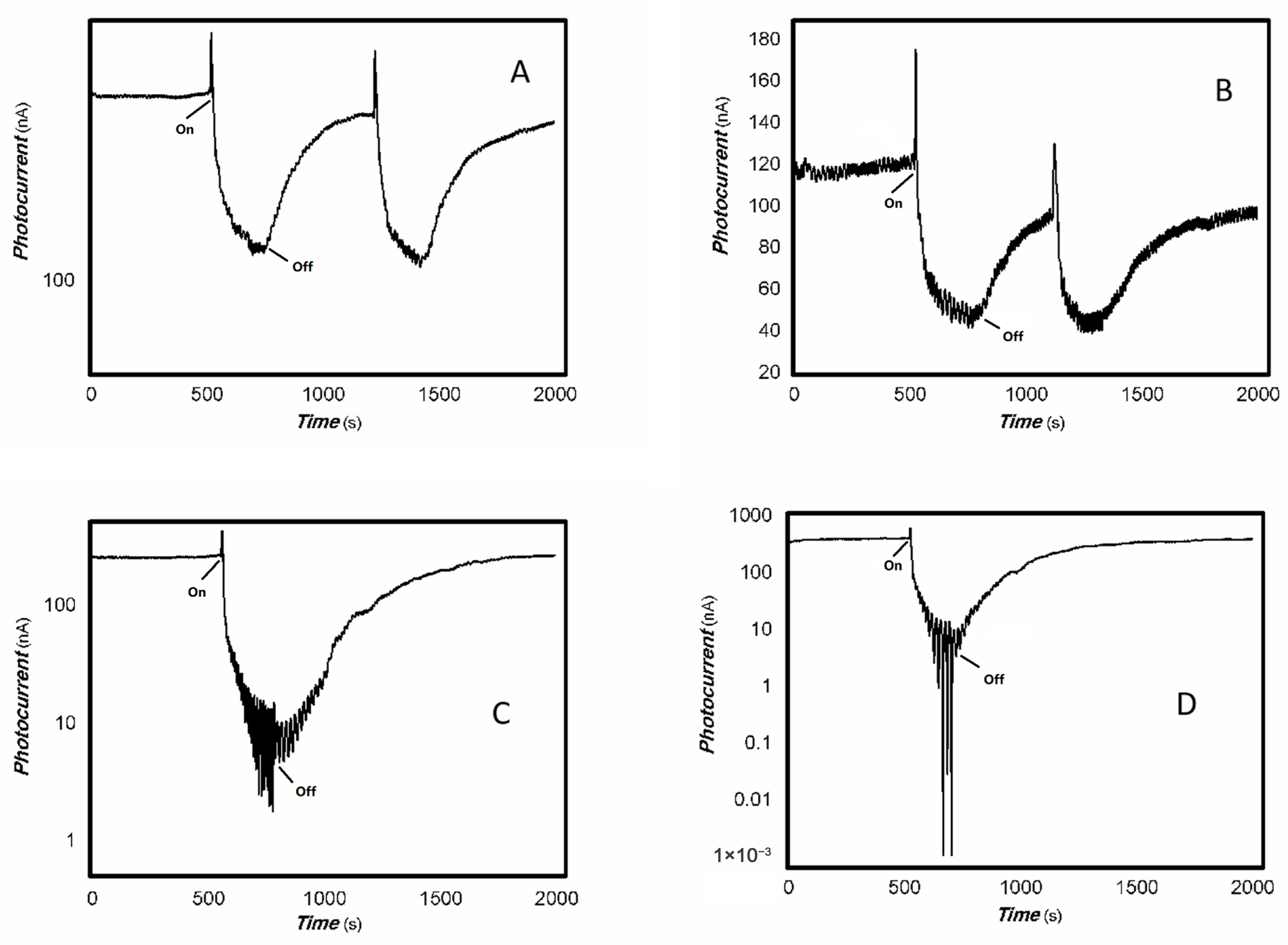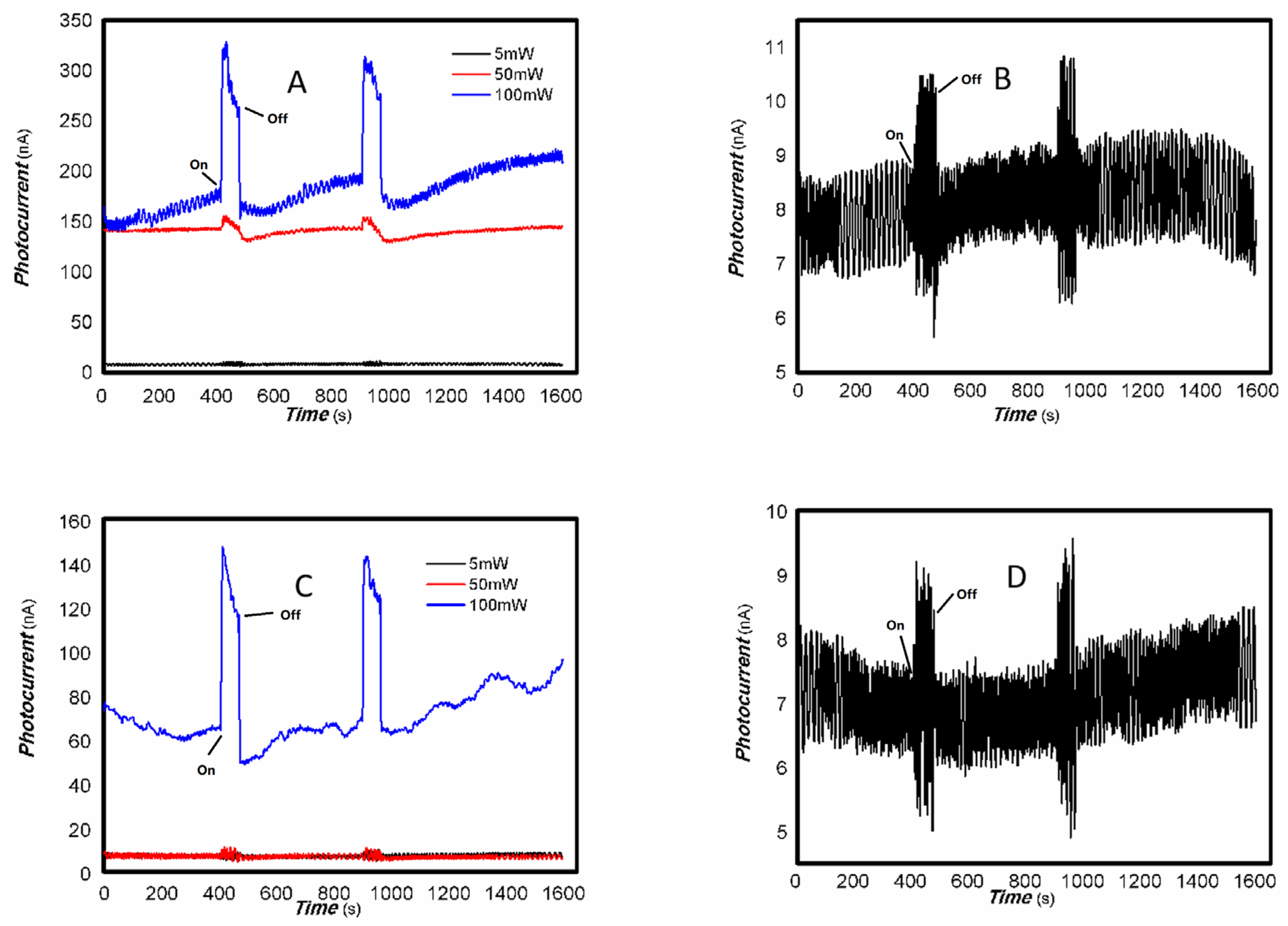 2.7. Photocurrent Response of Nanocomposite to the Visible Light and the NIR