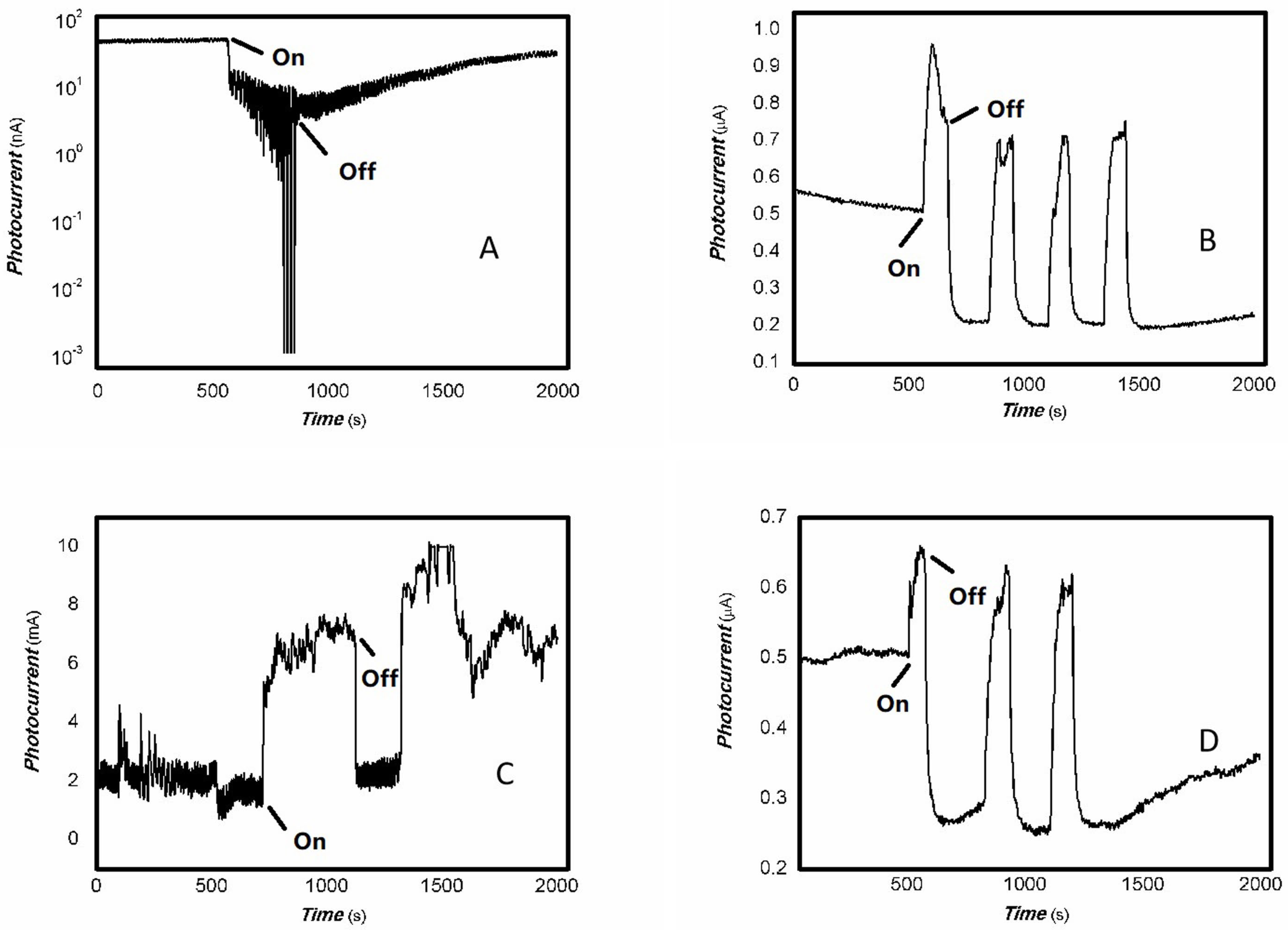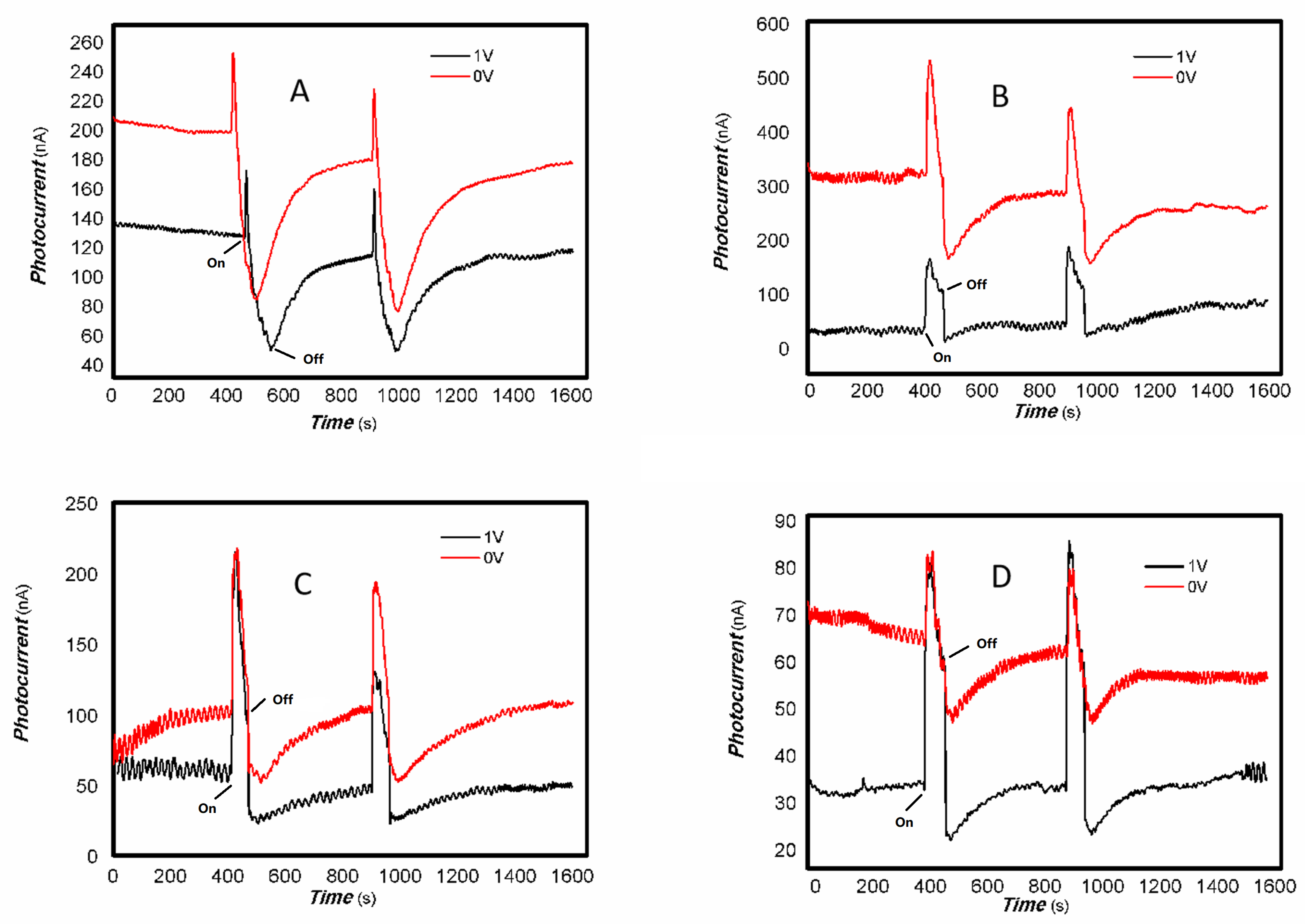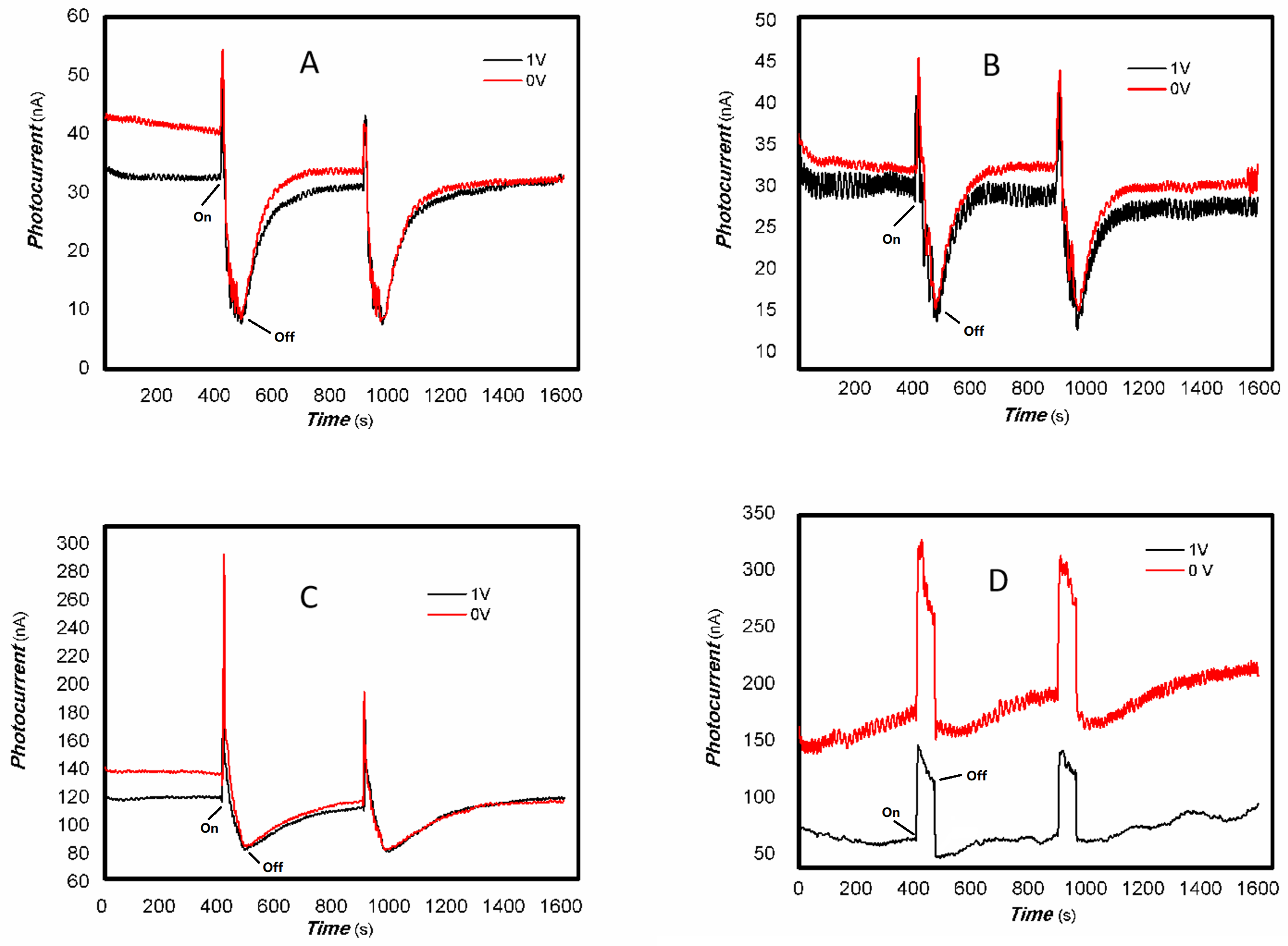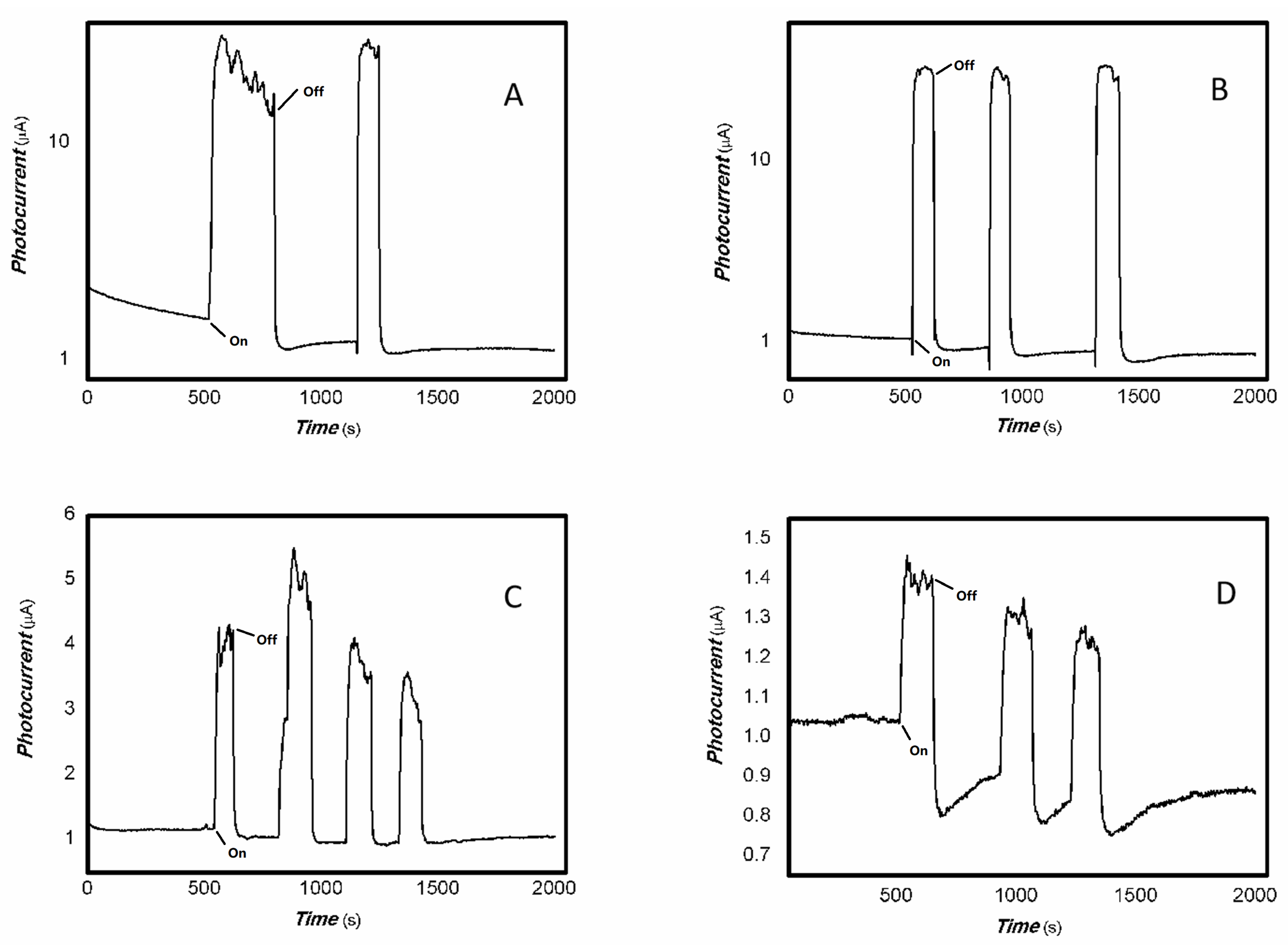 2.7. Photocurrent Response of Nanocomposite to the Visible Light and the NIR