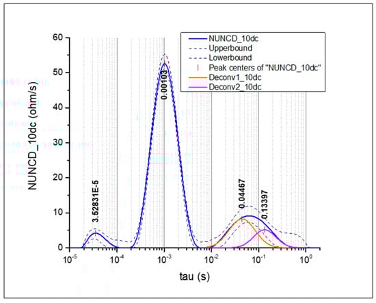When overlapping peaks were observed, the DRT spectrum was deconvoluted into Gaussian contributions, as illustrated in Figure 1, to discriminate the different electrochemical processes and quantify their individual resistances [21].