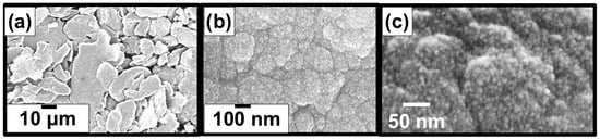 SEM micrographs of a N-UNCD film (Figure 2) show the surface morphology of the coating at three magnifications, highlighting that a continuous N-UNCD layer is indeed coating the surface of a NG/Cu anode. Figure 2a shows a large area at microscale, revealing a uniform film coverage across the surface. The morphology of the observed grains actually comes from the graphite and carbon black grains. N-UNCD covers the grains. Figure 2b reveals that the surface of the grains has a dense, coalesced nano- crystalline texture, which is characteristic of N-UNCD, with closely packed nodules and no obvious pinholes at this scale. Figure 2c reveals the ultrafine, “cauliflower-like” morphology at the tens-of-nanometers scale, consistent with the characteristic N-UNCD surface morphology characterized in extensive prior research related to N-UNCD coating of NG/Cu anodes and other substrate materials [12,14,22].