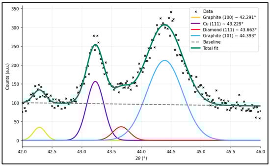 Figure 4 shows the 42–46° spectra of the XRD pattern. In the 42–46° window, the reflections near 42.3° and 44.4° correspond to the graphite (100) and (101) planes, consistent with Boehm [25]. The strong peak at ~43.3° arises from the Cu (111) substrate as described by Cullity and Stock [26]. The shoulder at ~43.7–43.9° matches the diamond (111) reflection reported for UNCD films [27], and the additional broadening observed in the N-UNCD samples is in line with the nitrogen incorporation effects described by Sumant et al. [28]. Its presence—once the overlapping contributions are separated—confirms that a diamond phase (consistent with UNCD and N-UNCD) is present on top of the NG/Cu stack.