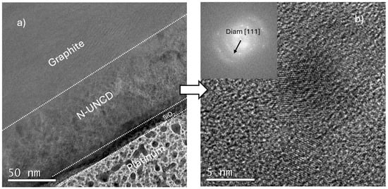 HRTEM images: (a) Image showing graphite/N-UNCD/SiO2/Pt layers (the Pt layer used to protect all other layers from ion impact during focused ion beam fabrication of cross-section sample). (b) HRTEM image showing the characteristic N-UNCD structure.