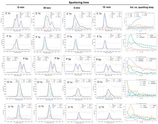 At the surface (0–30 s sputtering), the spectra are dominated by C 1s sp3, C–O, and O–C=O components, accompanied by strong F 1s peaks corresponding to PVDF (–CF2–) and LiPF6. The P 2p region shows LiPF6 and partially hydrolyzed LixPOyFz, while O 1s exhibits broad signals attributed to carbonates and alkoxides. This topmost layer thus corrsponds to the polymeric and organic SEI phase.