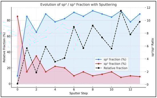 After 5 min of sputtering, the C 1s spectra show a rapid increase in the sp2 fraction, while sp3 and oxygenated species decline, indicating the partial removal of the UNCD-derived interfacial carbon and SEI matrix. This is clearly indicated in Figure 7.