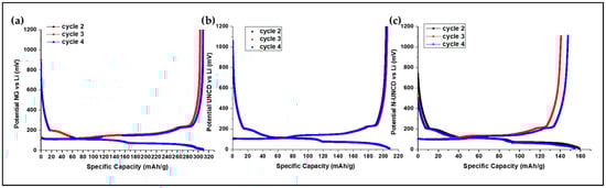 To better understand the early interfacial behavior, Figure 8 shows the charge– discharge voltage profiles recorded between cycles 2 and 4 for the reference (NG/Cu), UNCD/NG/Cu, and N-UNCD/NG/Cu anodes in the half-cells LIBs. All three configurations exhibit the characteristic potential plateaus near 0.1 V and 0.2 V associated with the LiC12 → LiC6 phase transition, confirming the typical lithium intercalation mechanism within graphite.