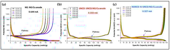 Charge and discharge plots from cycle 10 to cycle 60 for LIB with (a) Ng/Cu anode; (b) UNCD-coated NG/Cu anode, and (c) N-UNCD-coated NG/Cu anode.