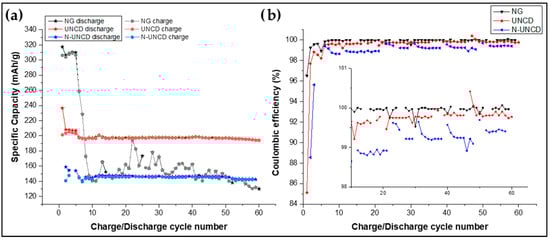 (a) Specific capacity and (b) Coulombic efficiency for LIBs with NG/Cu and UNCD and N-UNCD-coated NG/Cu anodes.
