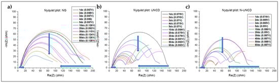 Figure 10b displays the Coulombic efficiency of the LIB cells. While all three LIB cells exhibit efficiency values ranging between 98.5% and 100%, the LIB half-cell with N-UNCD-coated NG/Cu anode shows a cyclic dependency in its efficiency. This behavior is attributed to the testing protocol, where the cells were periodically removed for electrochemical impedance spectroscopy (EIS) measurements every 10 cycles. Interestingly, this cyclic variation is not observed in the LIB half-cells with NG/Cu or UNCD-coated NG/Cu anodes, suggesting that the presence of nitrogen in N-UNCD may be influencing this behavior.
