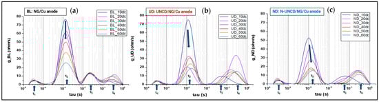 When comparing all three anode configurations, it becomes evident that the UNCD and N-UNCD-coated NG/Cu anode exhibit slower degradation of τ4 with cycling, demonstrating that both coatings preserve the electrochemical accessibility of the graphite domains. Moreover, the absence of any additional peaks in the DRT spectra (as shown in Figure 12) reinforces that neither coating introduces new interfacial reactions or secondary storage mechanisms; instead, their effect is limited to improving the structural and electronic stability of the active electrode surface.