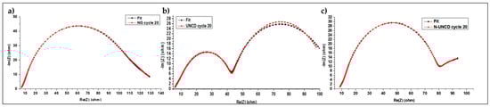 Once the general shape was matched, fine-tuning was performed using the Simplex optimization method, adjusting the resistance (R) and phase coefficient (a) of each Q element. The parameter a was constrained within 0.5 ≤ a ≤ 1 to preserve the capacitive behavior of Q. The corresponding pseudo-capacitances (C) were then computed to construct equivalent electrical circuit models for each half-cell [20].