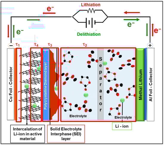 To facilitate the discussion by having a graphical support, Figure 15 shows a generic representation of the half-cell used for this study. The first section (with time constant τ1) depicts the area for electronic transport, which occurs from the current collector (copper foil) passing through the anode paste (80% natural graphite, 10% Acetylene Black and 10% pdf binder). This section also has dielectric properties, causing a capacitive response. The second section (with time constant τ4) depicts the area of ionic intercalation of the Li+ in graphite. The third section (with time constant τ3) is the area of SEI formation, which combines with UNCD or N-UNCD. The fourth section (with time constant τ2) is the area of ionic transport of Li+ through the electrolyte, which has resistive and capacitive characteristics. It is assumed that Li+ comes from Li metal.