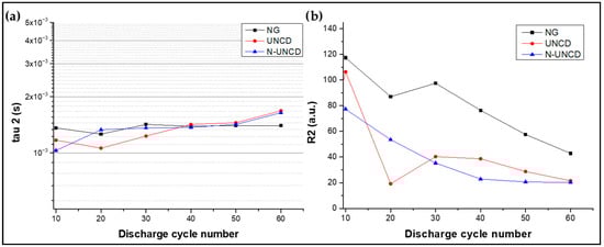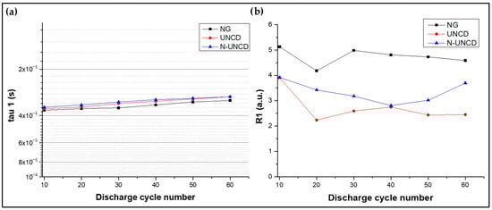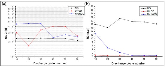 Importantly, the τ3 trends for the UNCD and N-UNCD coated anodes diverge from those of the NG/Cu anode performance, reflecting a distinct interfacial response. These results confirm that the UNCD and N-UNCD coatings do not act as active lithium storage media—the lithium intercalation process occurs exclusively within the NG component. Instead, the UNCD and N-UNCD coatings primarily enhance electrical contact stability and improve the mechanical integrity of the anode–collector interface, minimizing degradation under repeated charge/discharge cycling.