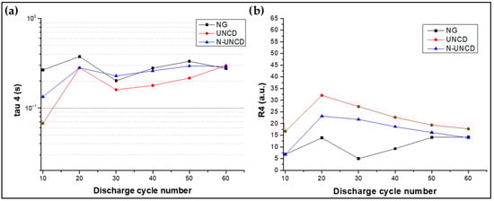 As illustrated in Figure 16a,b, all samples exhibit a similar trend with slight decrease in resistance with increasing discharge cycle numbers. N-UNCD exhibits a modest downward trend relative to NG and UNCD; however, in the absence of replicate cells and formal uncertainty analysis, we consider this difference suggestive rather than statistically significant.