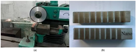 The experimental diagram of the grinding equipment and the macroscopic appearance of the finished workpiece are shown in Figure 4. The diagram shows the grinding equipment used in the experiment and the appearance of the workpiece after processing. By comparing the grinding effect of different grinding wheels, the different surface morphology produced by the two types of grinding wheels in the processing can be observed intuitively. At the macroscopic level, Figure 4 clearly shows the overall appearance of the workpiece after grinding, which can reflect key features such as the roughness and surface uniformity during the grinding process.