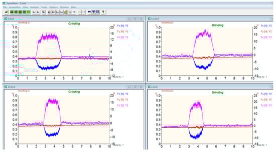 Open the image signal processing software, in the editing options only choose to retain the Fx, Fy, Fz three channels, which means that it will only show the force measuring instrument measured Fx, Fy, Fz three directions of the data, respectively, corresponding to the grinding process of tangential force, axial force, and normal force. Then, the filtering process is carried out, and the value of 500 is set in the window size option, and some data graphs are obtained as follows.