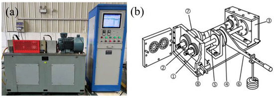 The tests were conducted on an FZG gear contact test rig (Jinan Shunmao Test Instrument Co., Ltd., Jinan, China), which features a center distance of 91.5 mm, a maximum power capacity of 8 kW, and a maximum rotational speed of 2900 r/min. Mechanical loading was employed to ensure accurate load application, monitored by a high-precision torque sensor accuracy class 0.1% to ensure that measurement uncertainties remain negligible relative to the applied load steps. A circulating water-cooling system was coupled with a temperature sensor in Figure 3 with corresponding component descriptions summarized in Table 4 to strictly regulate the oil temperature in the gearbox, maintaining it below 60 °C with minimal fluctuation throughout all load steps. This active thermal management effectively mitigates any geometric heat dissipation constraints imposed by the narrow 14 mm tooth width and ensures that the lubricant viscosity and friction coefficient remain constant, thereby stabilizing the surface traction and the resulting subsurface shear stress distribution pattern throughout the long-cycle testing.