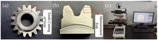 Hardness gradient measurement method: (a) tooth cutting of gears; (b) measurement path; (c) microhardness testing device, The red box in (c) indicates the position of the specimen during testing.