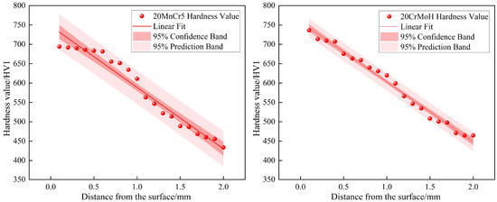 It is acknowledged that the hardness profile of carburized layers typically follows a non-linear distribution. However, to quantitatively compare the property degradation rates, a linear regression analysis was performed on the high-density measurement data. The shaded regions in Figure 11 represent the 95% confidence bands of the linear fit. The narrow width of these bands, combined with high coefficients of determination, statistically confirms that the calculated hardness gradients are robust descriptors of the subsurface material properties, effectively distinguishing the physical trend from measurement scatter. Crucially, this statistical stability extends specifically to the carburized–core transition zone, where the narrow confidence bands confirm that the gradient transition is a stable material property rather than an artifact of local heterogeneity.