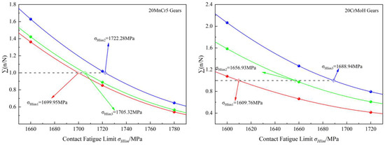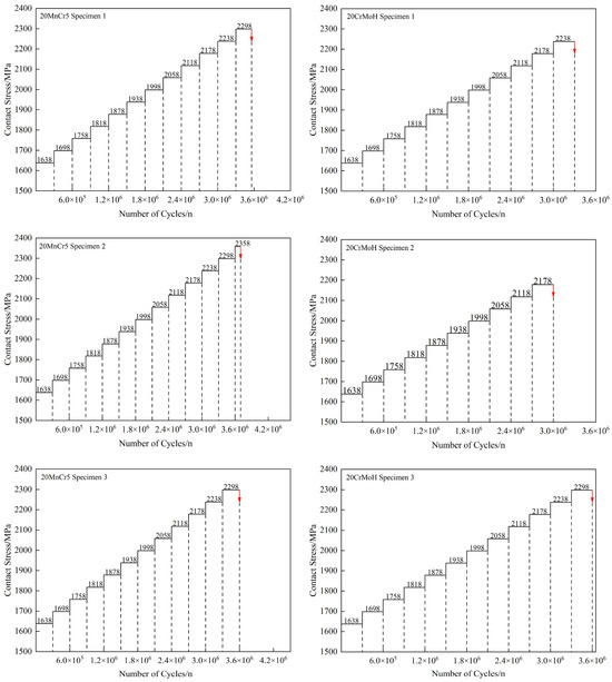 To efficiently and accurately compare the contact fatigue limits of 20MnCr5 and 20CrMoH gears, the step-loading method was employed in this study. Based on the Palmgren–Miner linear cumulative damage rule, this approach enables rapid estimation of the material’s fatigue limit using a single specimen subjected to progressively increasing contact stress levels, with fatigue failure identified at the first occurrence of pitting. The method is particularly suitable for comparative evaluation of gear contact fatigue performance across different materials. A schematic diagram illustrating the principle of this method is presented in Figure 4.