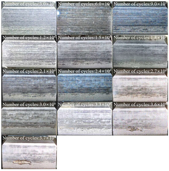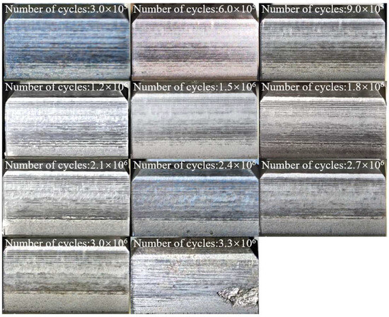 In accordance with standard practice, the step-loading method typically employs 10 to 15 stress levels. The contact stress on the test gears was calculated following the general procedure specified in GB/T 14229-2021, “Gear Contact Fatigue Strength Test Method” [32]. In this study, 13 distinct load levels were designed for the 20MnCr5 and 20CrMoH gears. Each load stage was maintained for a fixed duration of n = 3.0 × 105 cycles. At the end of each stage, the test rig was shut down, and the gear flanks were inspected using a portable optical microscope. The failure criterion was defined as the first observation of macroscopic pitting damage (single pit area > 0.5 mm2 or aggregate area > 4% of the active flank). If no pitting was observed, the load was increased to the next level, and the cycle count resumed. This specific cycle increment and the precise determination of the failure point provide the necessary variables for the Palmgren–Miner linear cumulative damage calculation described in Equation (1). After assembly, a running-in test was conducted under a torque of 35.3 Nm and a rotational speed of 1450 r/min for 2 × 105 cycles to homogenize micro-geometrical variations and ensure consistent profile accuracy across all specimens prior to formal testing.