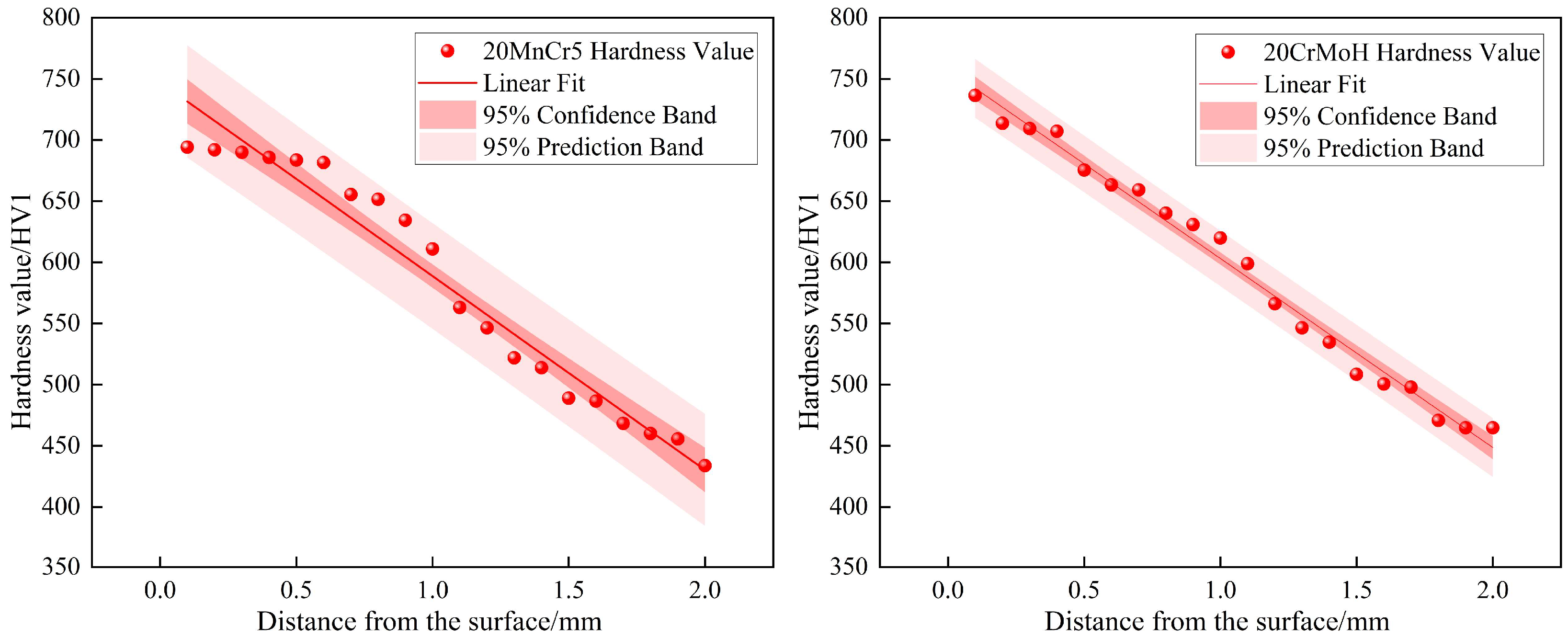 It is acknowledged that the hardness profile of carburized layers typically follows a non-linear distribution. However, to quantitatively compare the property degradation rates, a linear regression analysis was performed on the high-density measurement data. The shaded regions in