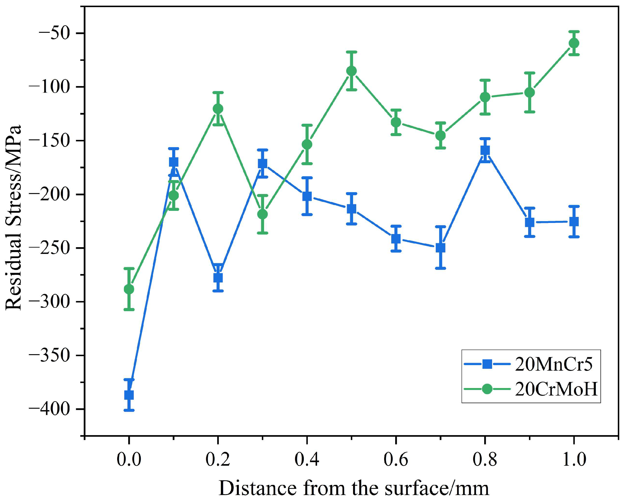 With increasing depth, the two materials display markedly different residual stress attenuation behaviors. The 20MnCr5 gear maintains relatively stable residual stress levels within the 0–0.5 mm depth range, fluctuating between −169.9 MPa and −386.8 MPa. At the 0.5 mm depth, the residual stress measures approximately −213.4 MPa, remaining at −225.3 MPa even at the 1.0 mm depth, indicating gradual attenuation throughout the subsurface region. In contrast, the 20CrMoH gear exhibits more rapid stress attenuation, with residual stress declining to −85.1 MPa at 0.5 mm depth and further diminishing to −59.3 MPa at 1.0 mm depth.